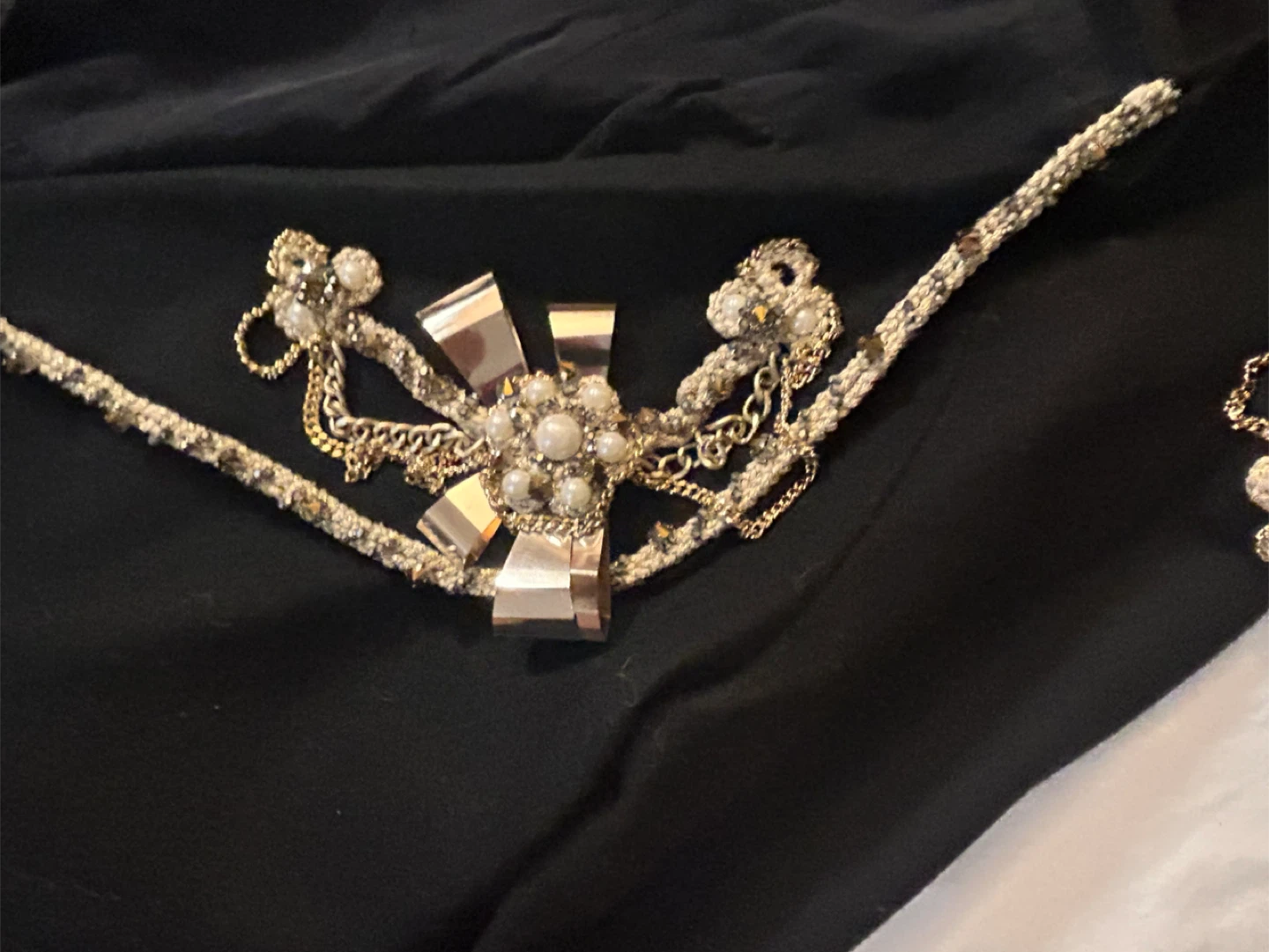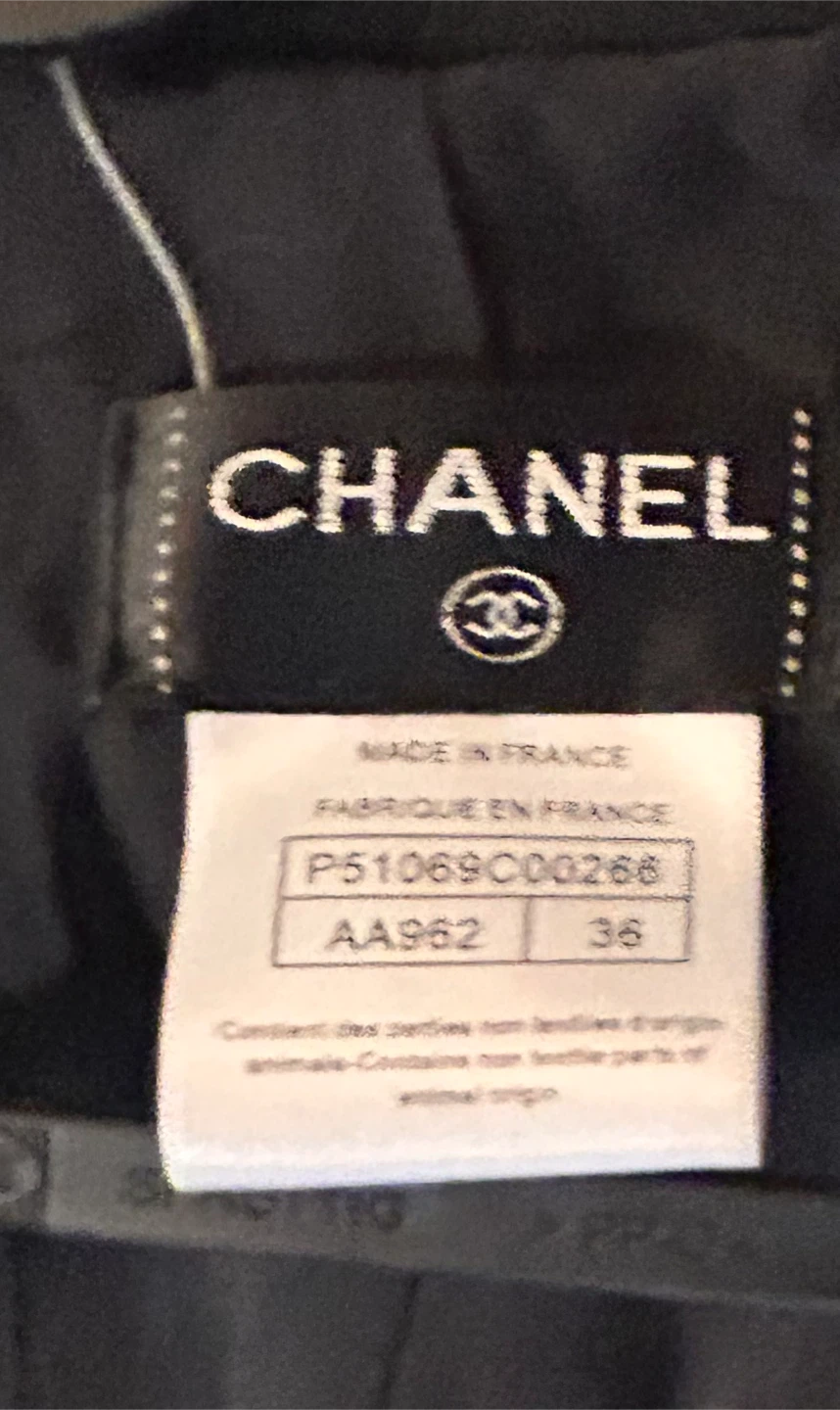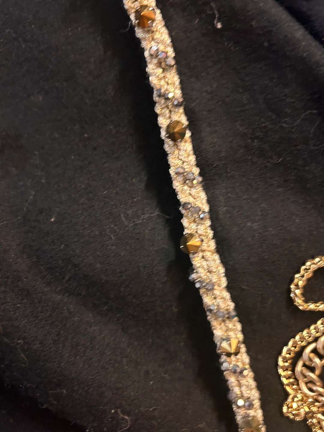 Selling a beautiful Chanel jacket in size 36. It's a stylish black jacket with unique embellishments and gold detailing. Perfect for adding a touch of elegance to any outfit!