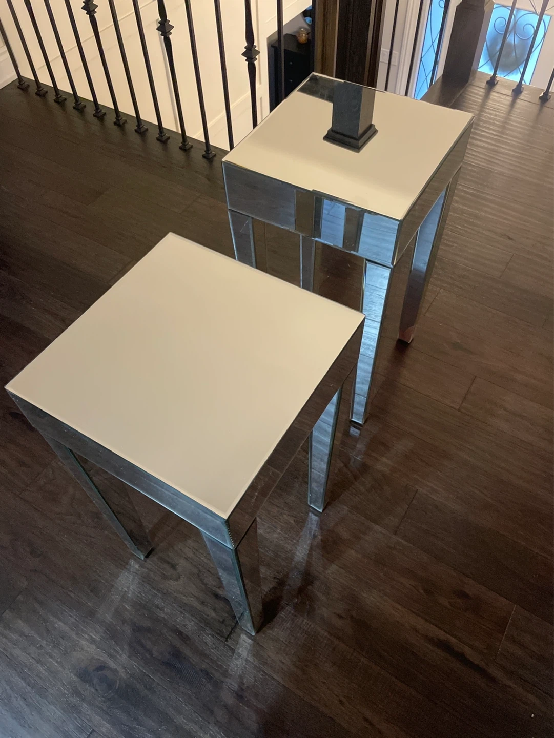 Mirrored end table with a sleek, modern design. Its reflective surface adds a touch of glam to any room. Great for placing a lamp or decorative items. Has slight discolouration on the bottom of the legs. 50 each or 80 for both