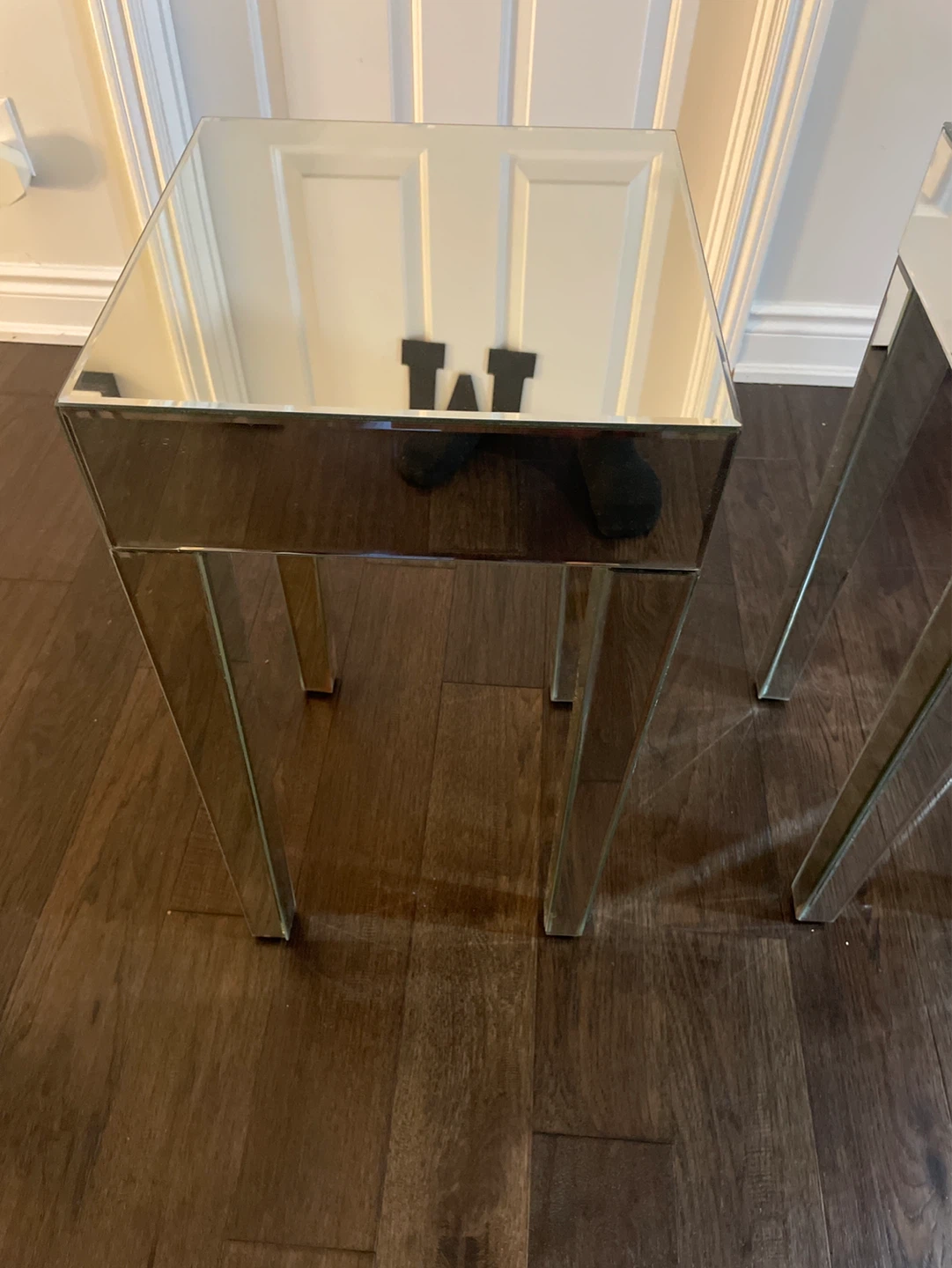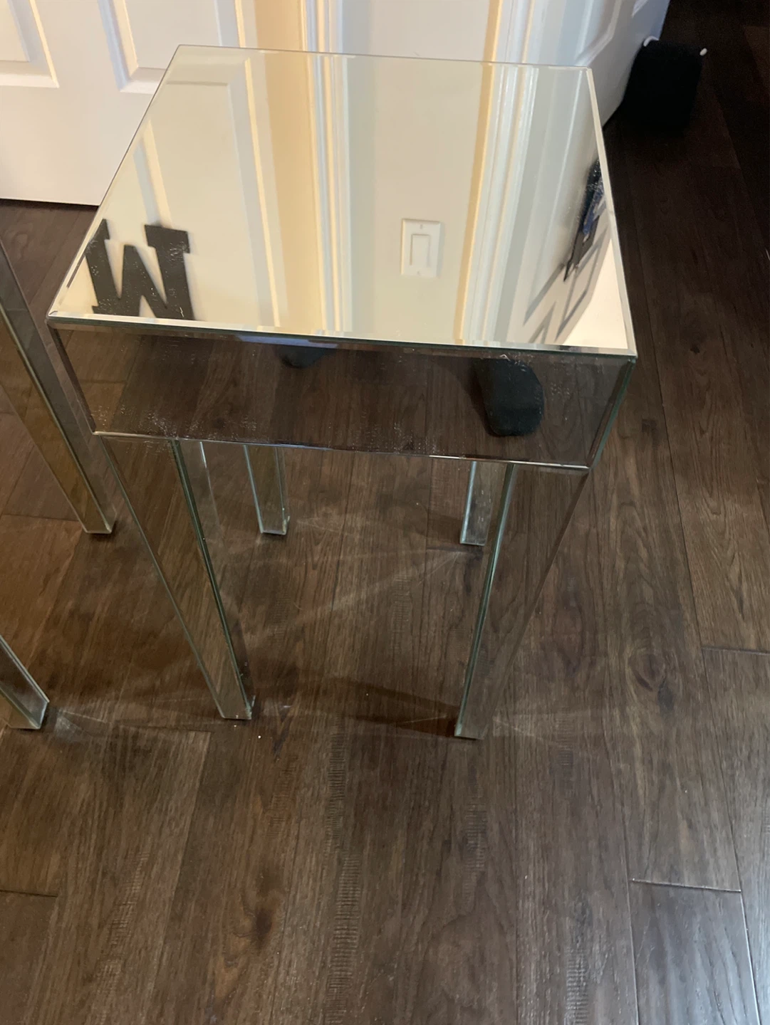 Mirrored end table with a sleek, modern design. Its reflective surface adds a touch of glam to any room. Great for placing a lamp or decorative items. Has slight discolouration on the bottom of the legs. 50 each or 80 for both