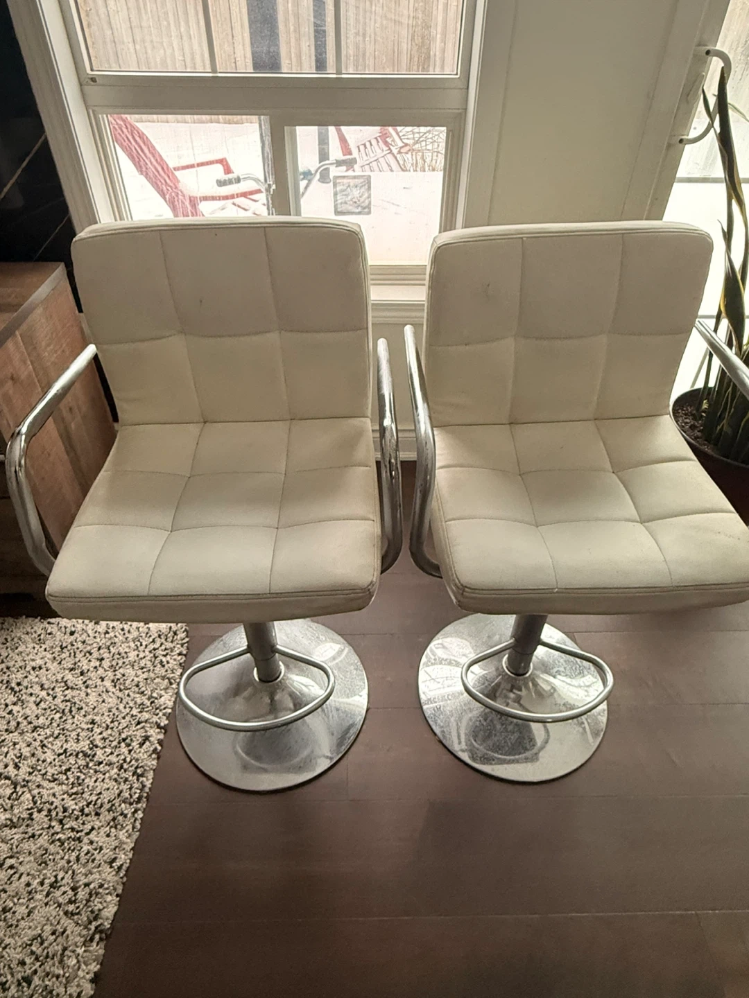 Selling a set of two cream-coloured, faux leather bar stools. They swivel and have adjustable height. The square seats are tufted and have chrome armrests and bases. These stools would be great for a kitchen island or home bar!