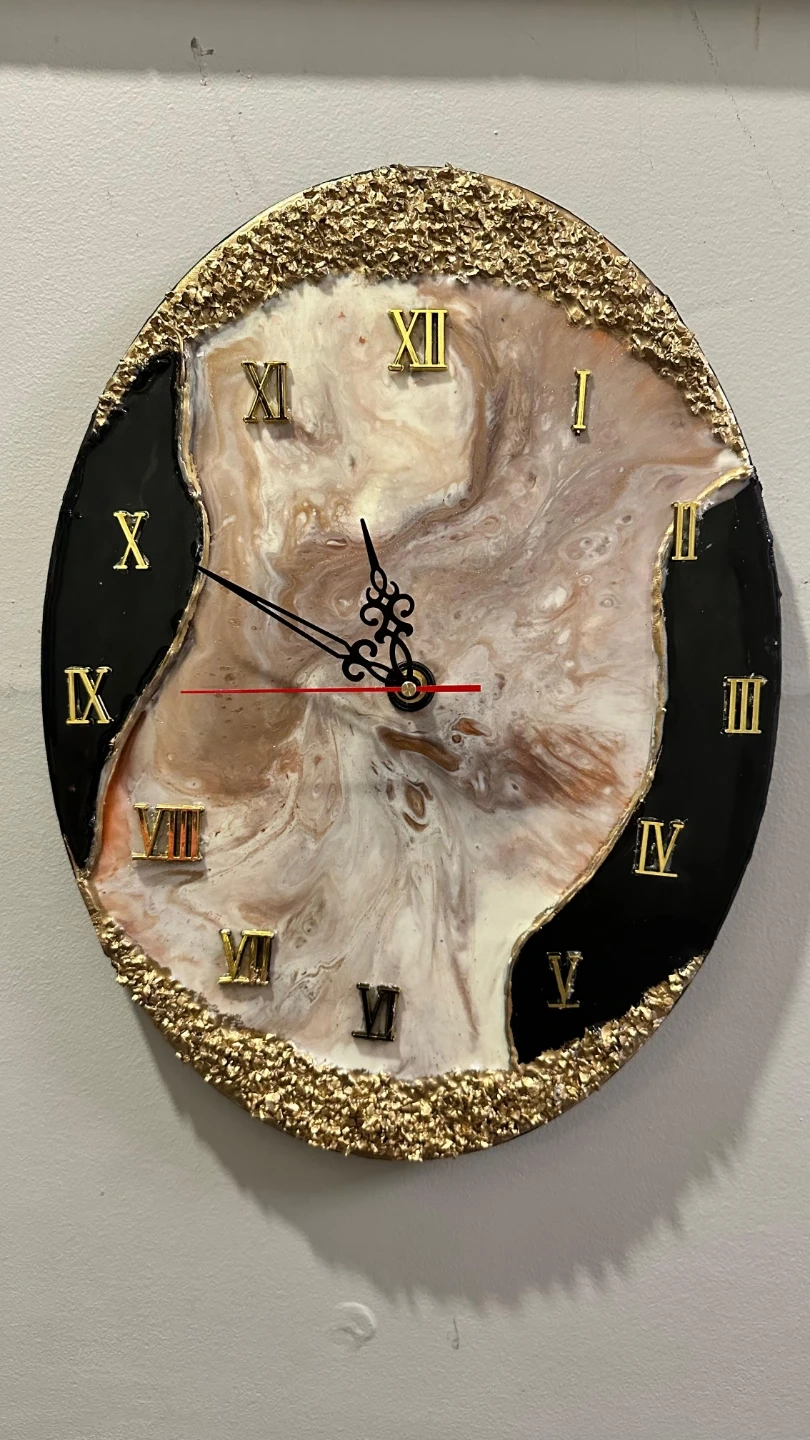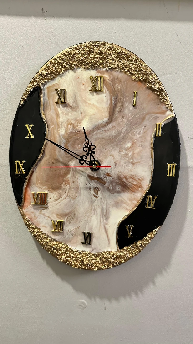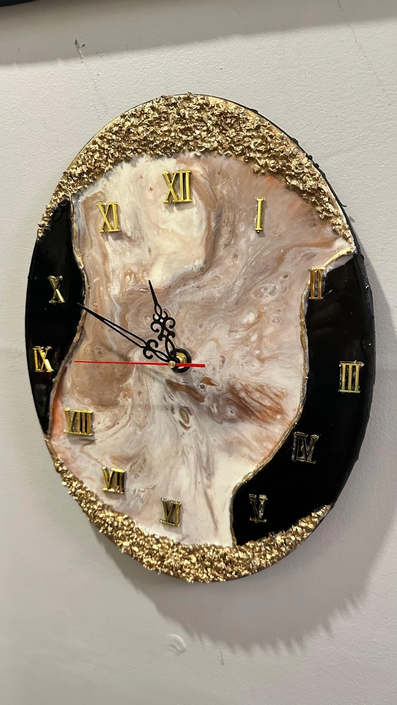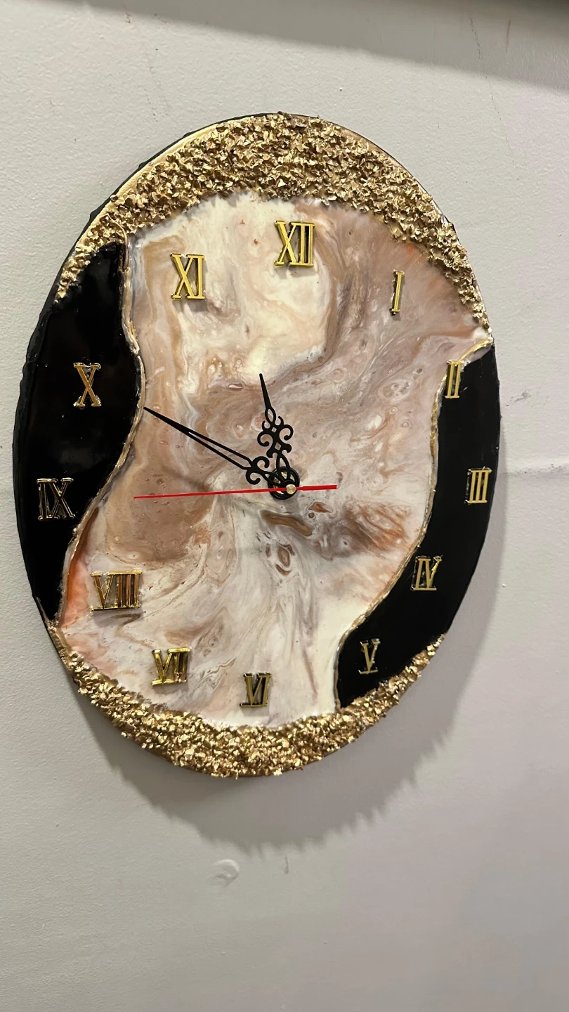 Selling a unique handmade resin wall clock! It features a blend of black, gold, and marble-like resin, making it a standout piece for any room....size 16x12 inches.