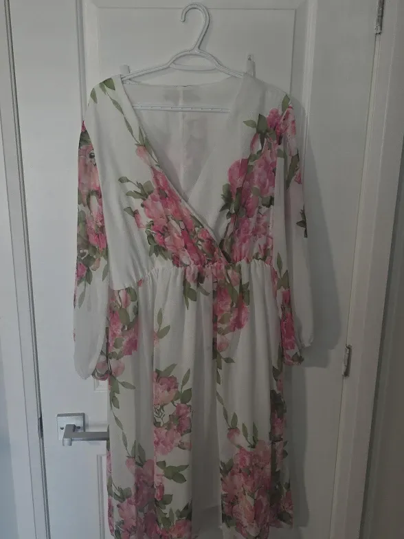 White midi dress with a vibrant pink and green floral print. It features a flattering wrap-style bodice and long, flowy sleeves. This dress is made from a lightweight, chiffon-like material.