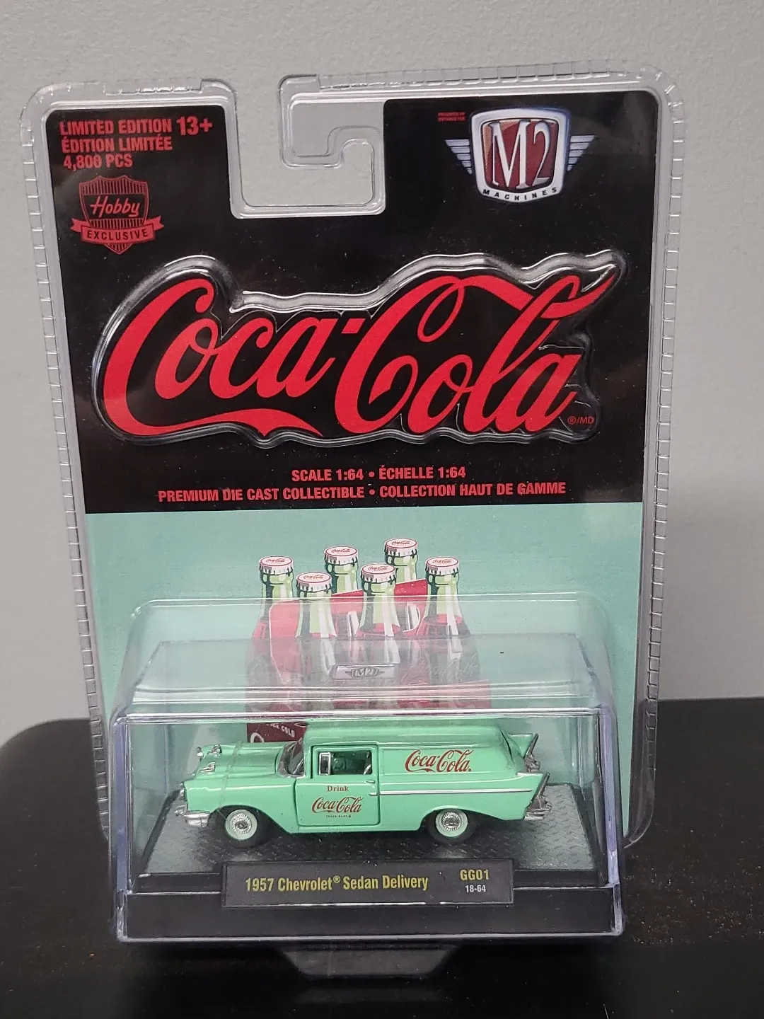 Limited edition M2 Machines Coca-Cola 1957 Chevrolet Sedan Delivery. This is a premium die-cast collectible in scale 1:64. It includes a display case with bottles. Great for collectors!