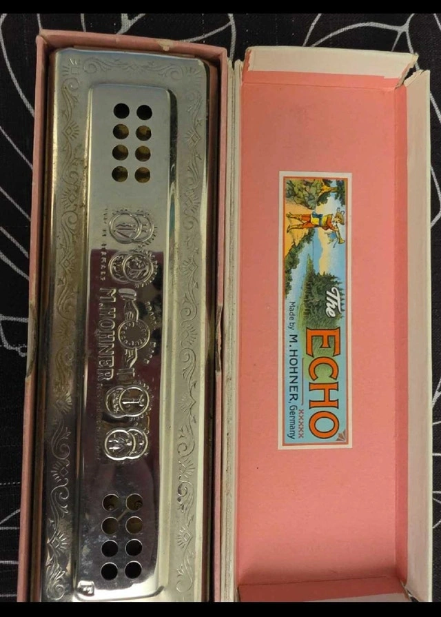 Beautiful vintage M. Hohner Echo harmonica with original packaging. Features Bell Metal Reeds and traditional German craftsmanship. A highly collectible instrument for historical instrument collectors.