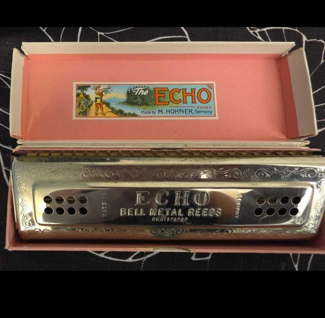 Beautiful vintage M. Hohner Echo harmonica with original packaging. Features Bell Metal Reeds and traditional German craftsmanship. A highly collectible instrument for historical instrument collectors.