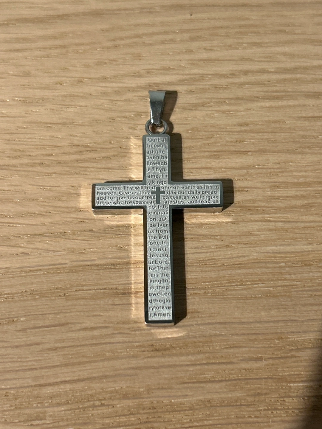 Silver-toned metal cross necklace. Features the Lord's Prayer etched onto the cross. Pendant style. Looking for offers