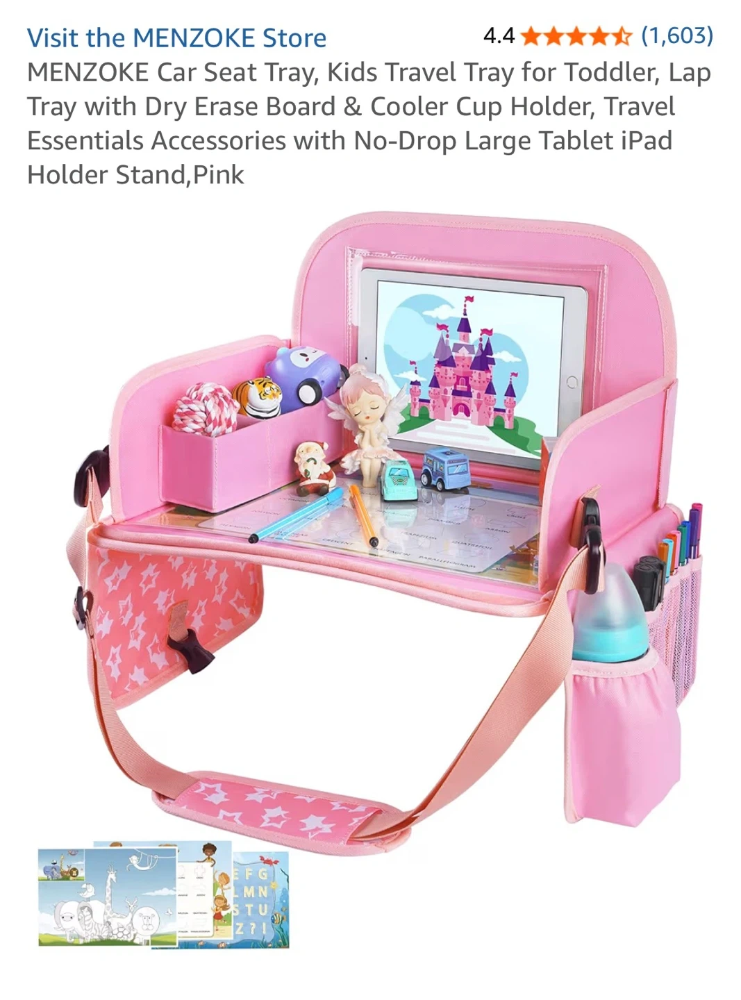 This MENZOKE travel tray is perfect for keeping little ones entertained on the go. It features a dry erase board, cup holder, and tablet stand. The tray is foldable and portable, great for cars, strollers, or even picnics. It's designed for easy cleaning too!