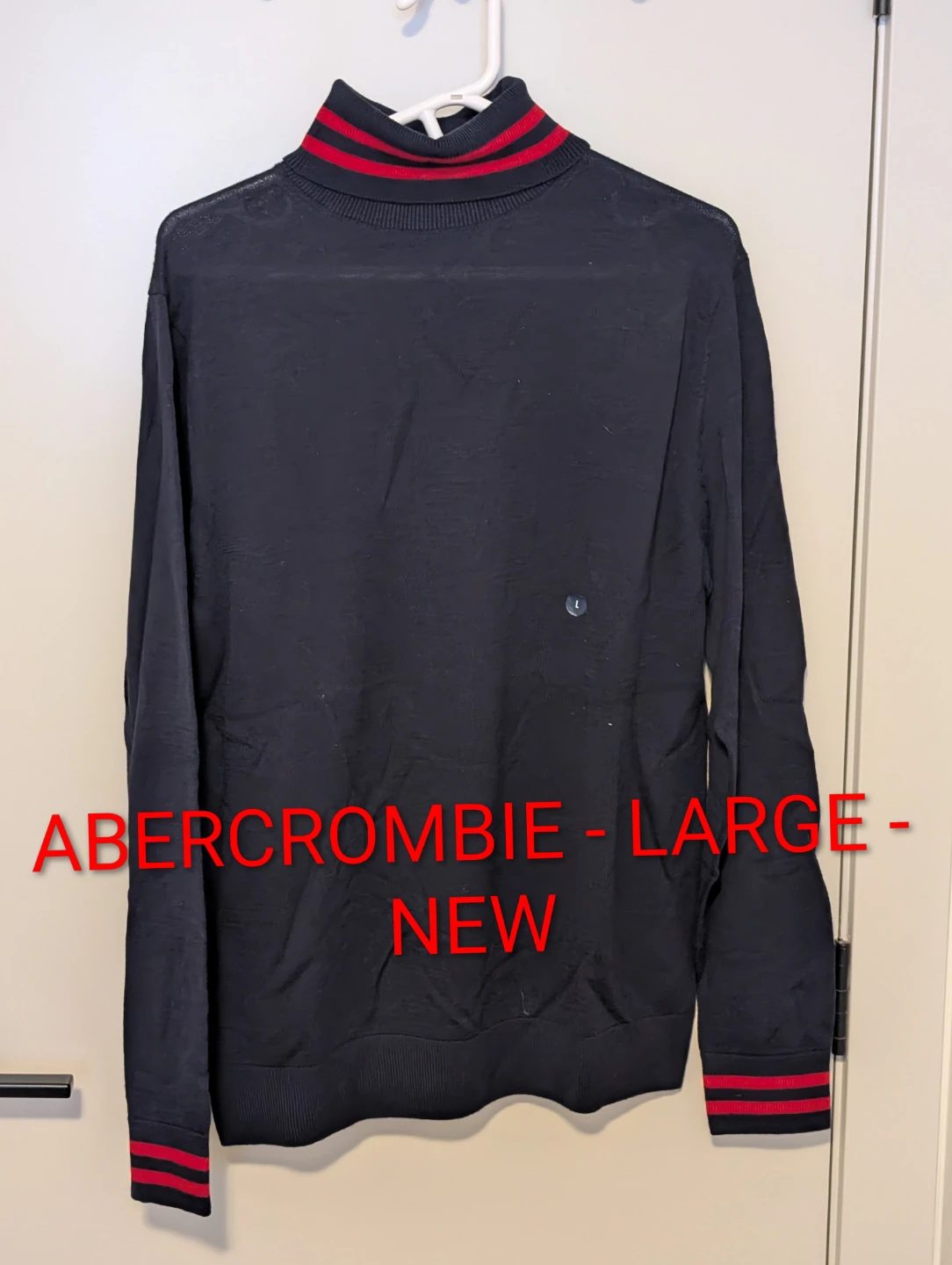 Selling a brand new Abercrombie turtleneck sweater! It's a size large and features a stylish black colour with red accents on the collar and cuffs. Never been worn!