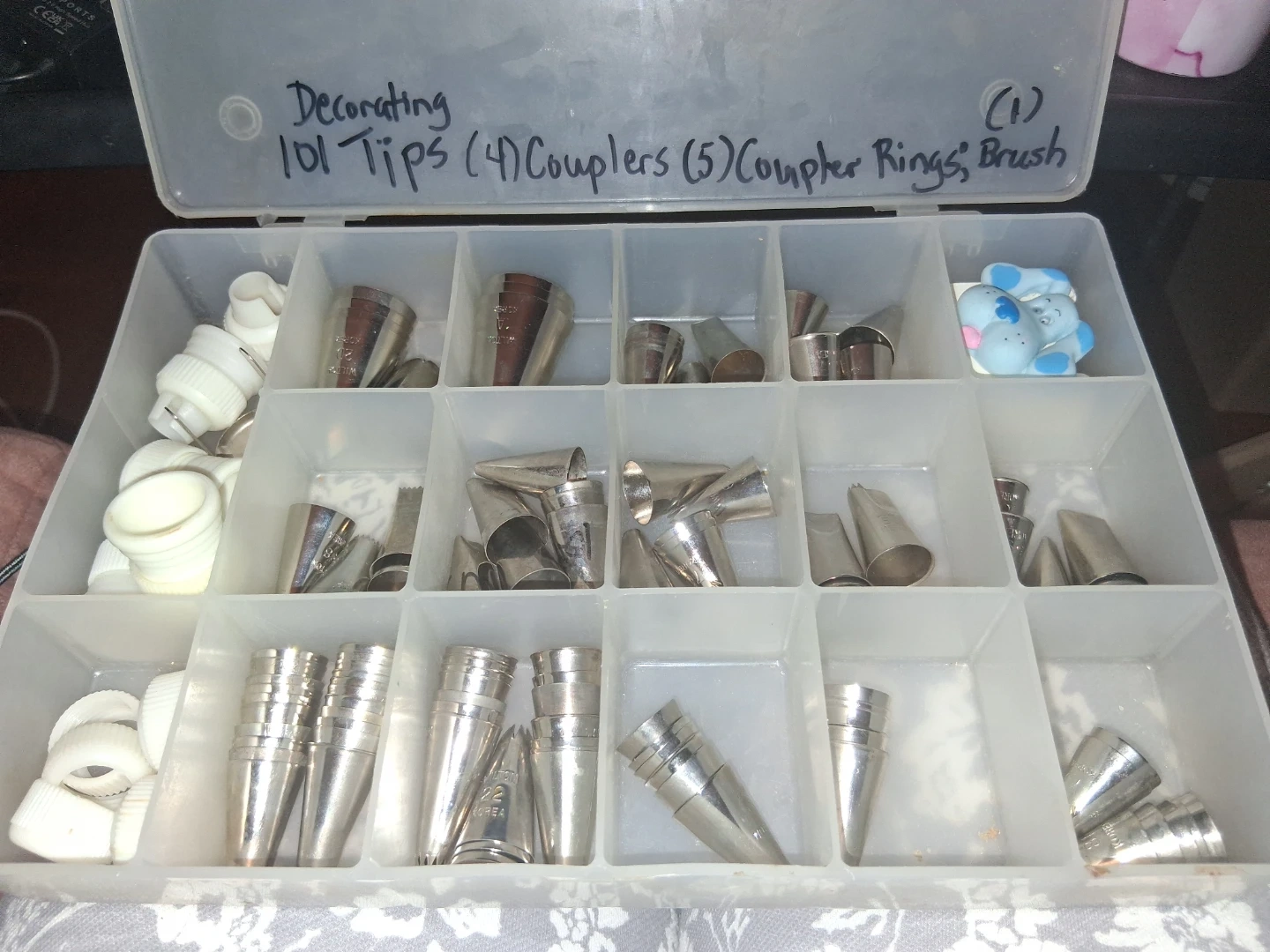 Selling a decorating tips set that includes 149 tips, 4 couplers, 5 coupler rings, and a brush! Some tips are double or triple of the same design. It comes in a handy storage box to keep everything organized. Majority are used in good condition and some new never used. Various style/patterns, sizes.