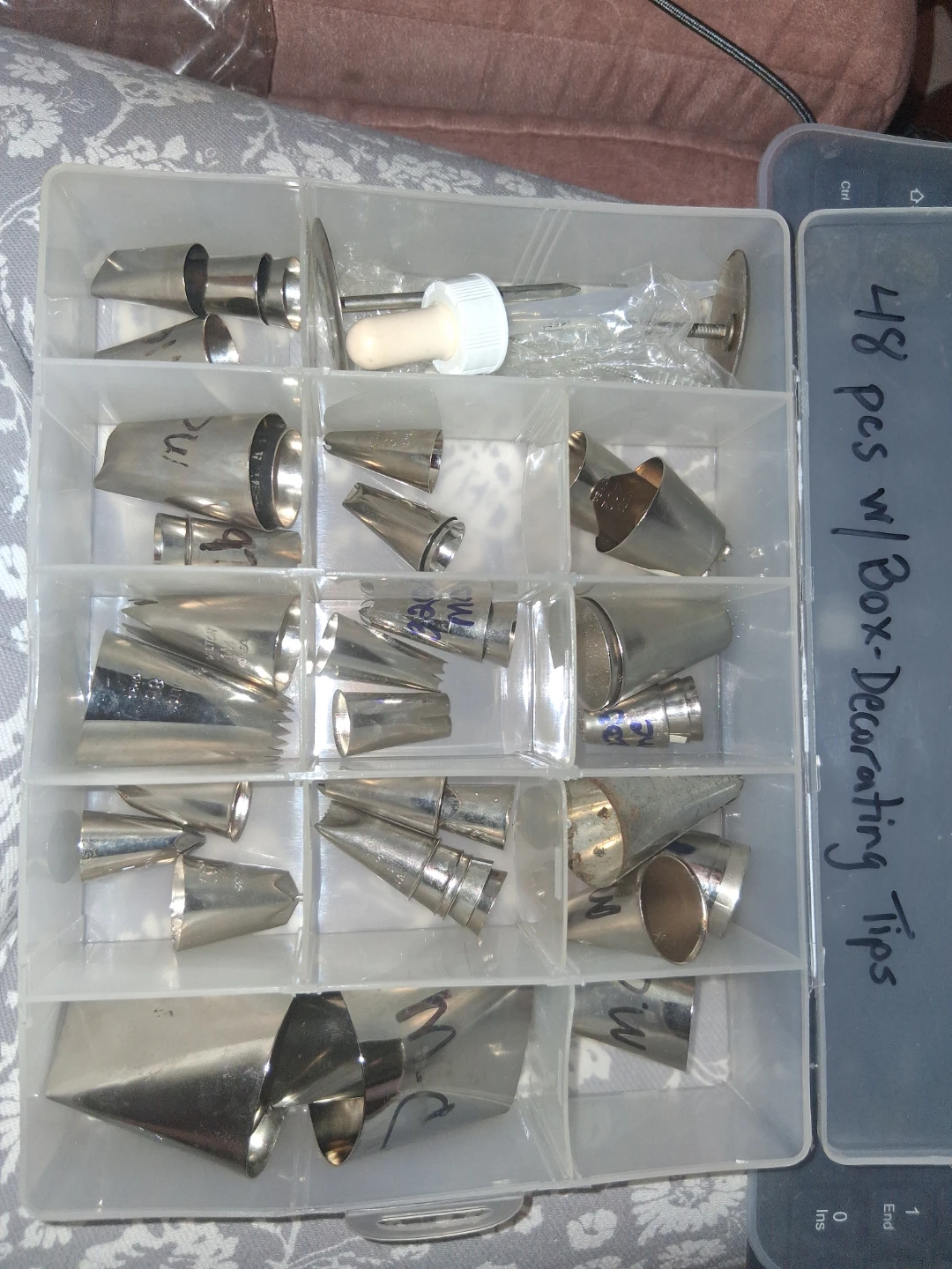 Selling a decorating tips set that includes 149 tips, 4 couplers, 5 coupler rings, and a brush! Some tips are double or triple of the same design. It comes in a handy storage box to keep everything organized. Majority are used in good condition and some new never used. Various style/patterns, sizes.