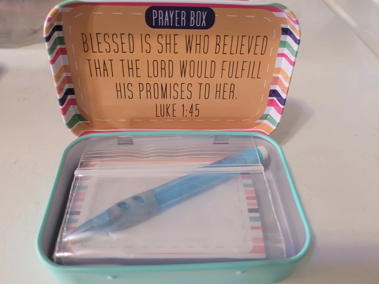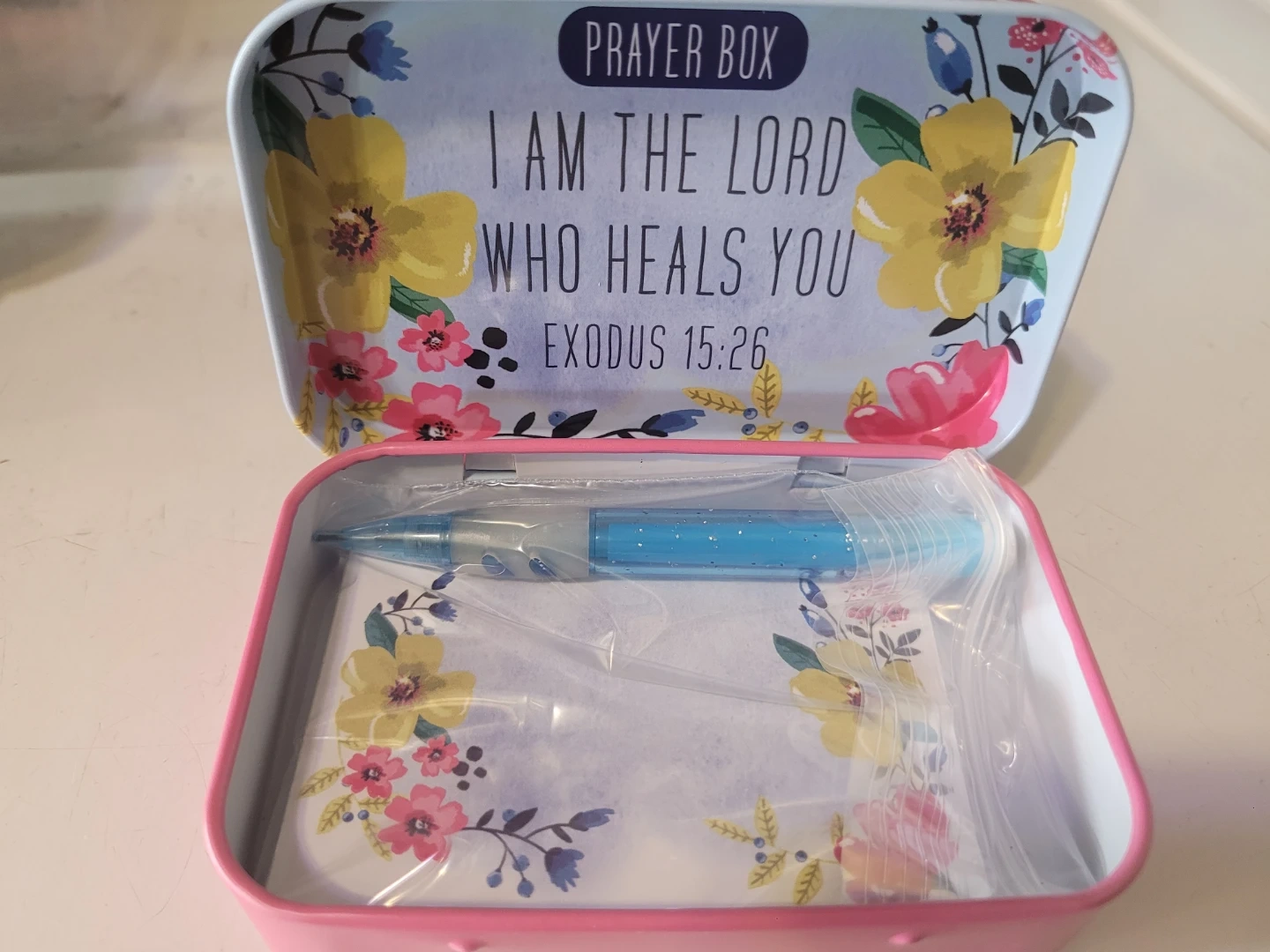 This prayer box features uplifting scriptures like Luke 1:45 and Exodus 15:26 inside the lid. It includes a blue pen and blank cards for writing prayers. The tin has a floral design on the outside with the phrase "Give It To God".