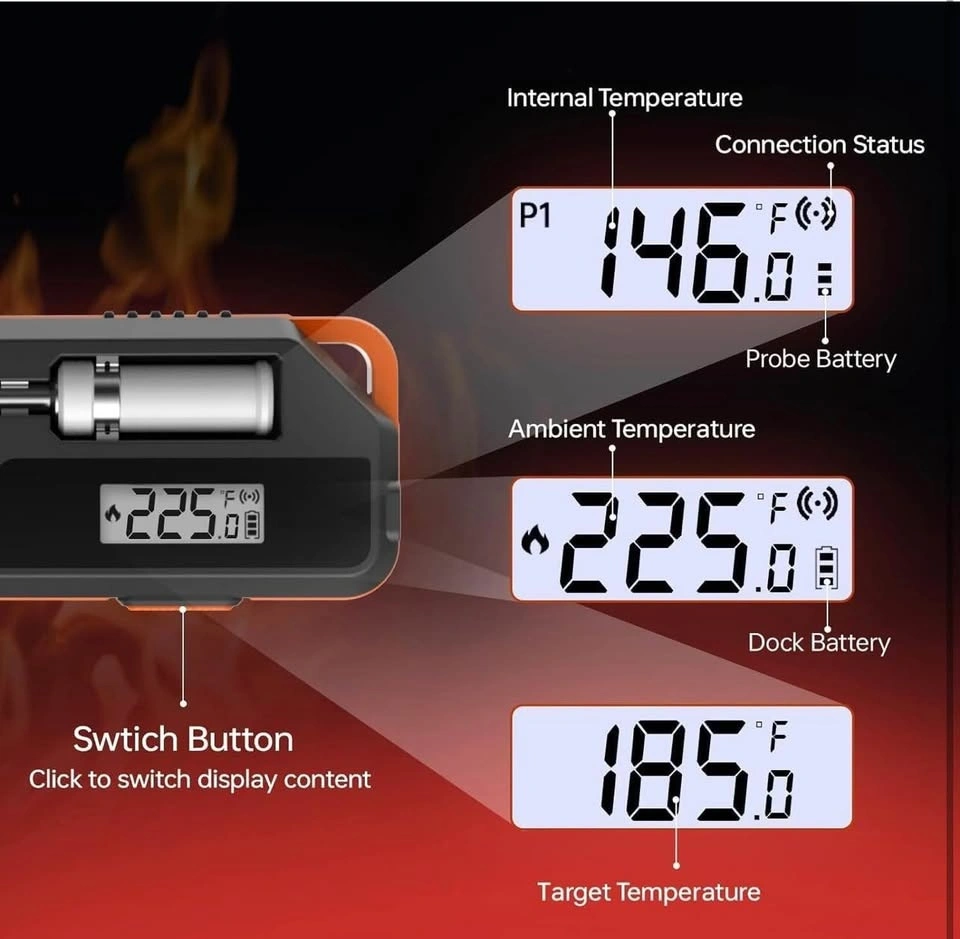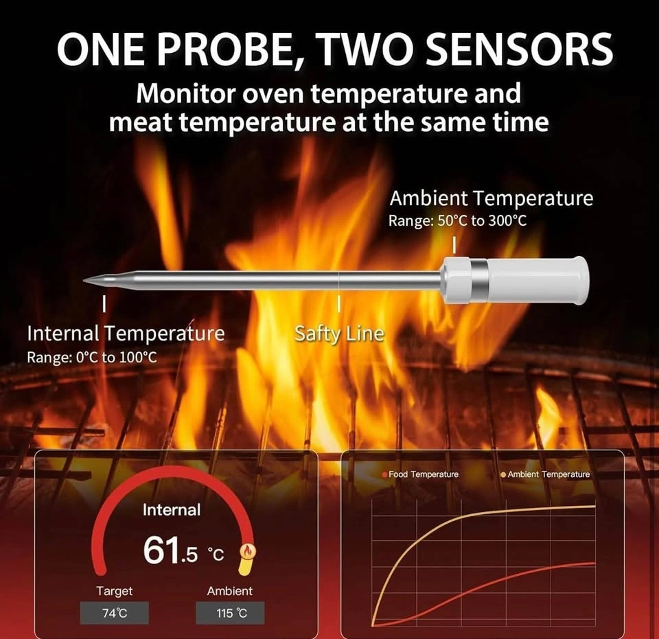This digital meat thermometer is great for BBQ, baking, meats, liquids, and candy making. It works with air fryers, ovens, grills, smokers, and more. It's 100% wireless with Bluetooth LE 5.2, offering a range of up to 229ft (70m) and can be monitored via an app for iOS and Android. The instant-read probe is highly accurate (±0.9) with a 2-3 second response time and features a magnetic back. It has dual sensors to monitor both internal meat temperature (up to 212°F) and ambient/external temperature (up to 572°F) simultaneously. The app includes an algorithm to estimate cooking and resting times and a guided cook system with custom alerts. The included ABS dock charges the probe and holds it securely. The display has a bright backlight for easy reading in any light. It's a perfect gift for BBQ lovers, chefs, and home cooks.