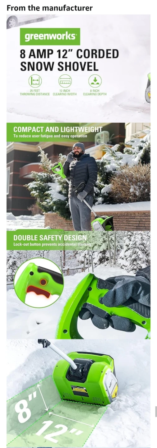 Greenworks 8 Amp 12-Inch Electric Corded Snow Shovel