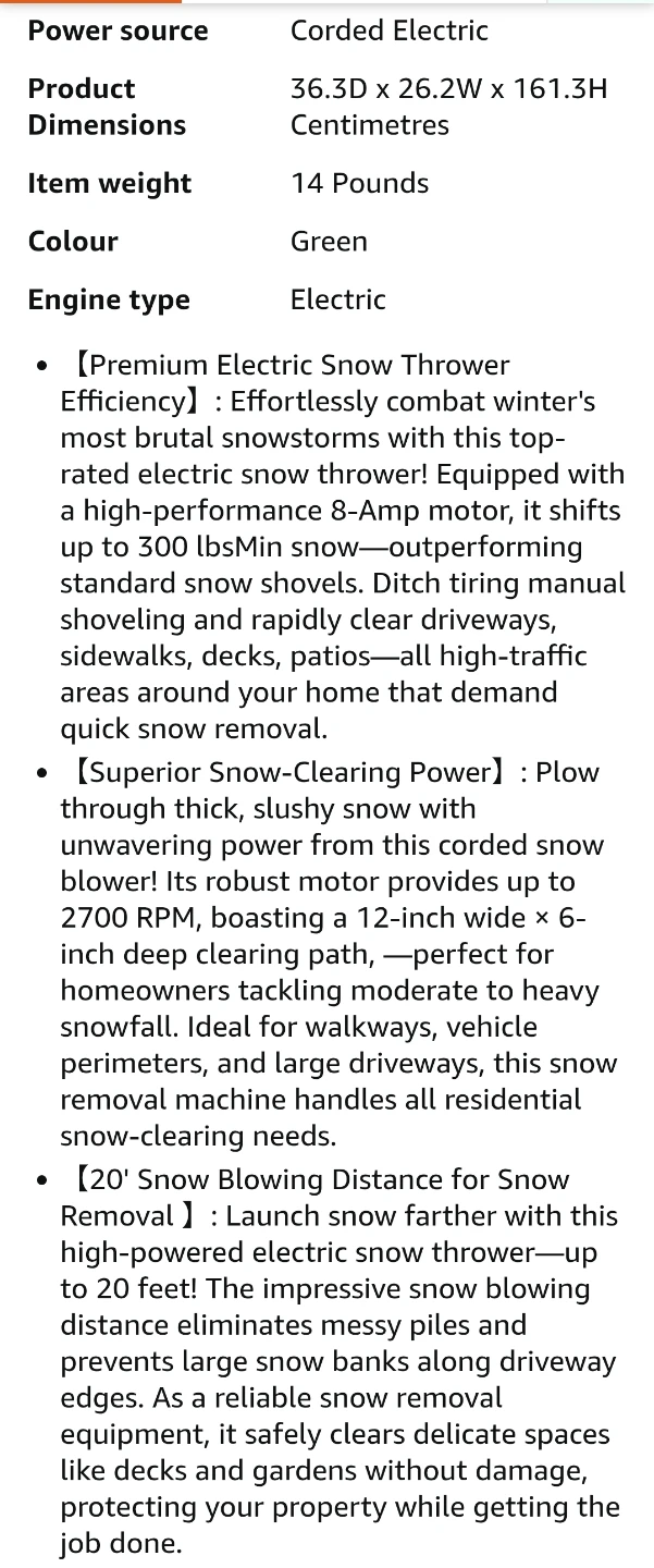 I'm offering a Greenworks 8 Amp 12-inch electric snow shovel, designed for clearing snow from patios, driveways, and sidewalks with a 20ft throwing distance. It's in great working condition!