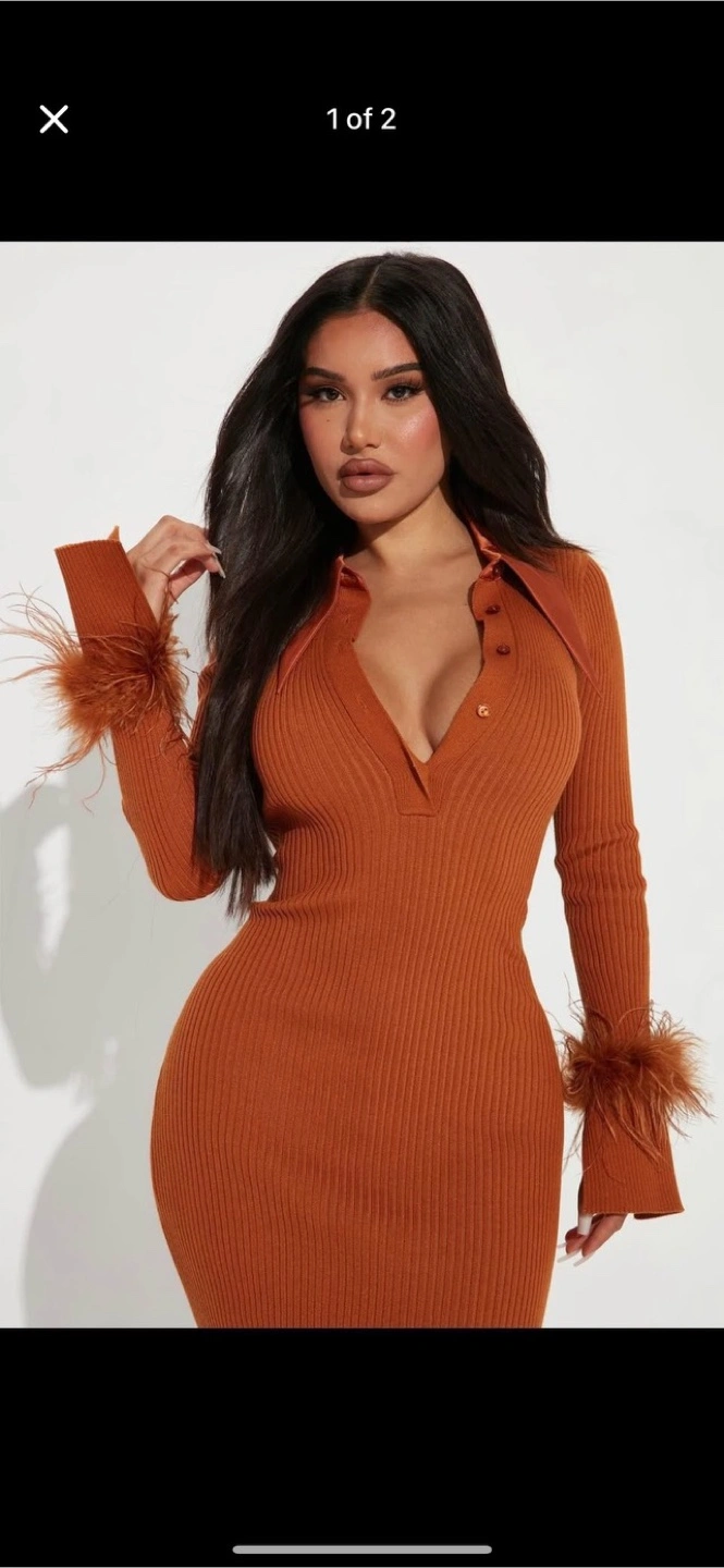 Long-sleeved, ribbed dress. Featuring a collared neckline. Cuffs detailed with feathers. It's the perfect piece for a relaxing evening out.