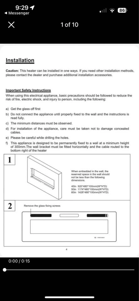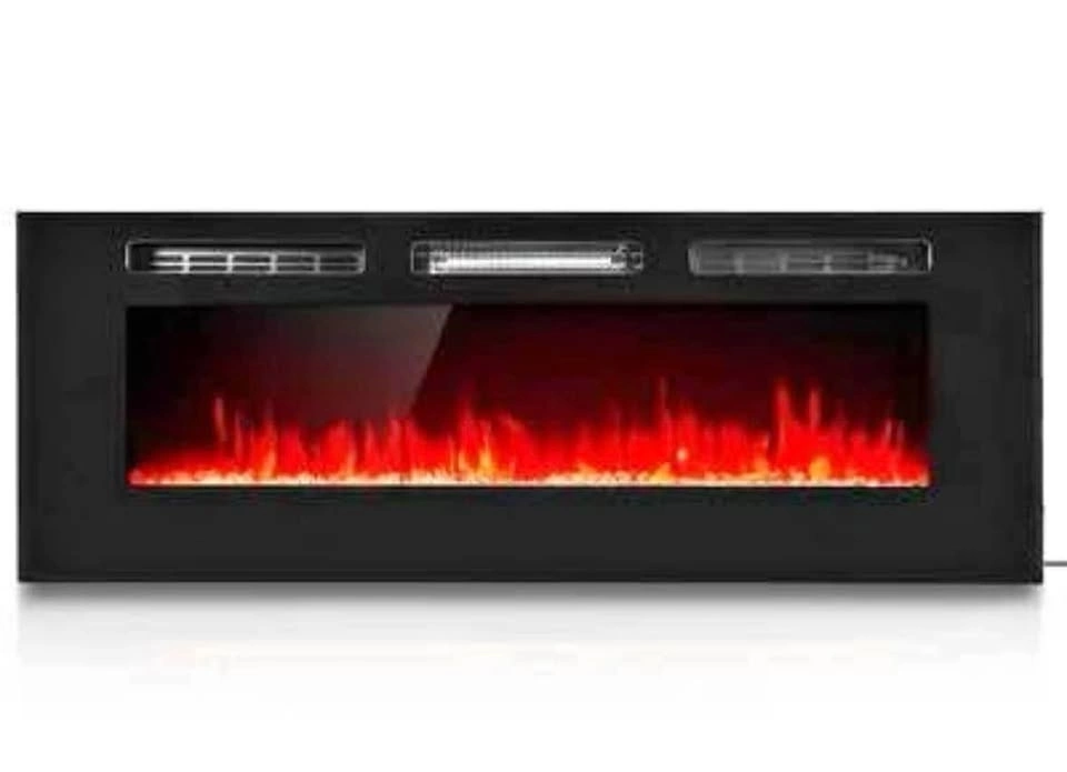 Brand new 60" electric fireplace. Wall mounted or recessed with pebble or log flame effect. Features remote control and touchscreen. Flame effect can be used independently of heat. Manual touch switch on fire. Fan heater with choice of 2 heat settings. Adjustable flame color and brightness. Safety thermal cut-off device. 1400W - 120V - 60Hz.