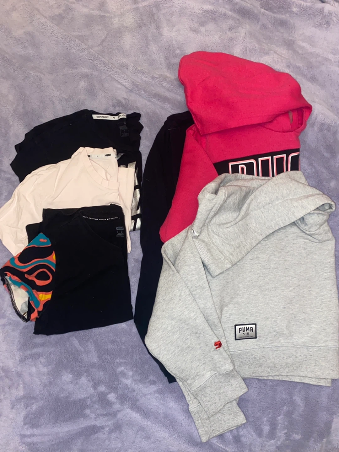 Bundle includes a black t-shirt with colourful sleeves, a black t-shirt with stacked Puma logos, a pink cropped shirt and a grey Puma cropped hoodie, a pink Puma cropped Hoodie. Plus an Ardene Black long sleeve.