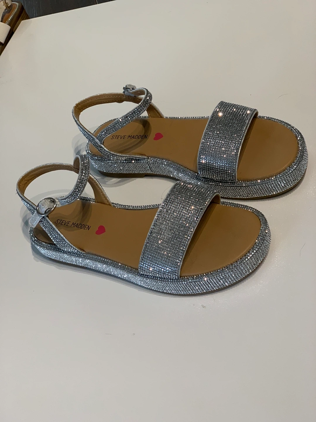 These Steve Madden sandals are covered in dazzling silver (actual) rhinestones. They feature adjustable ankle straps for a secure fit.