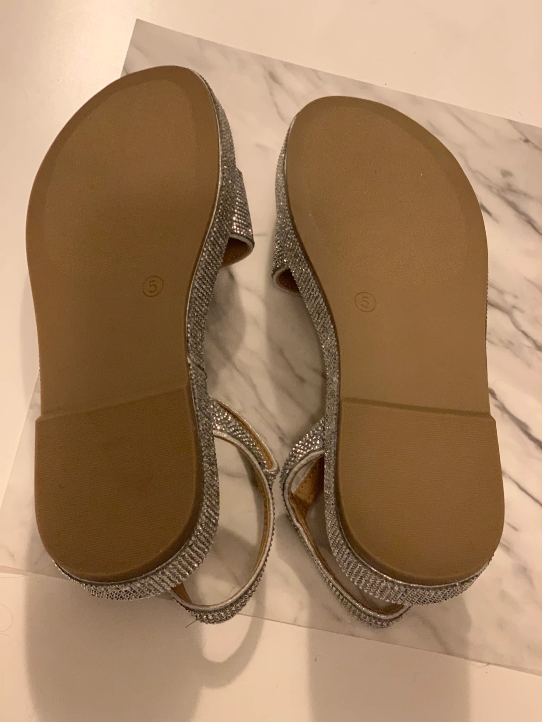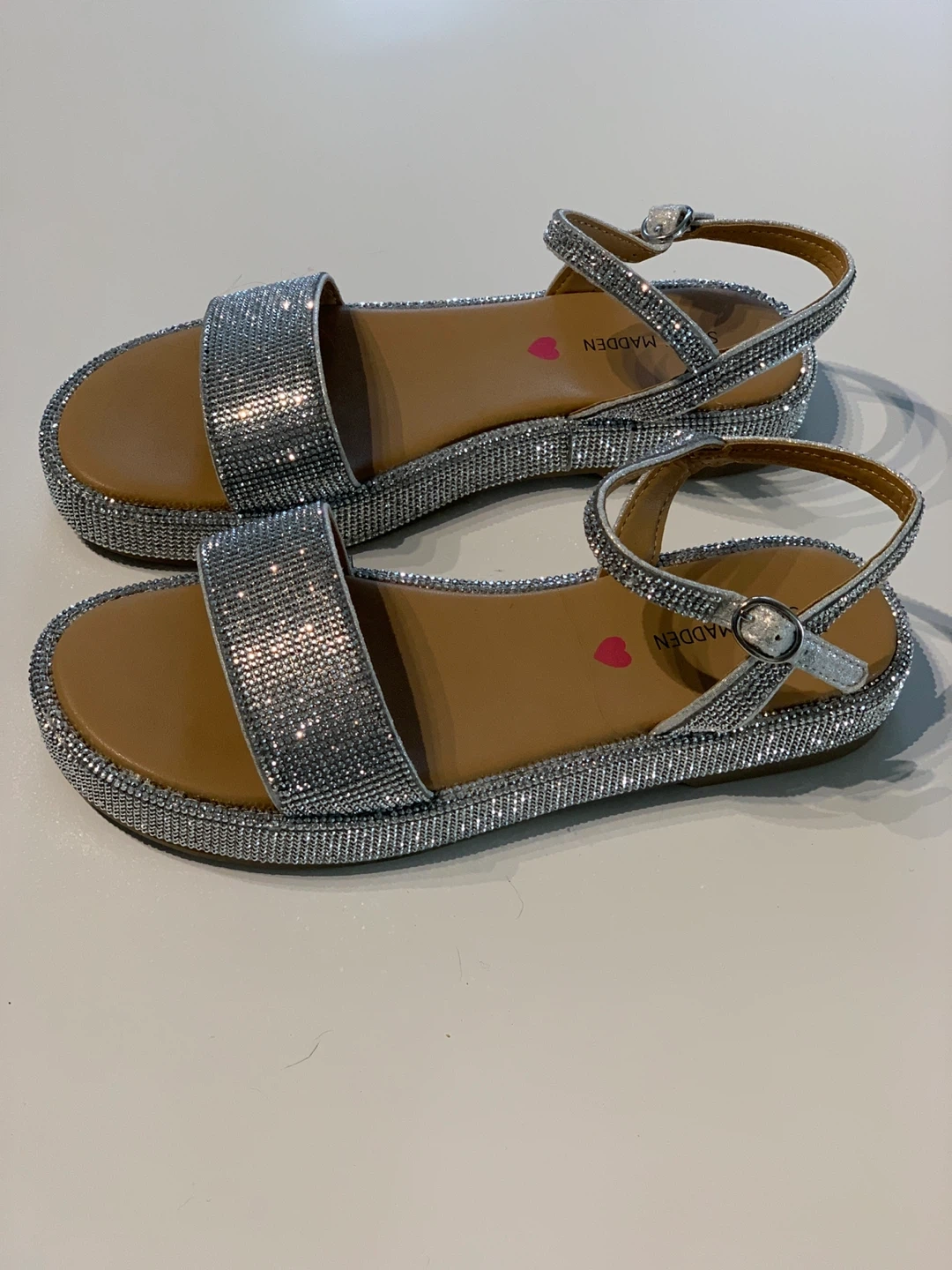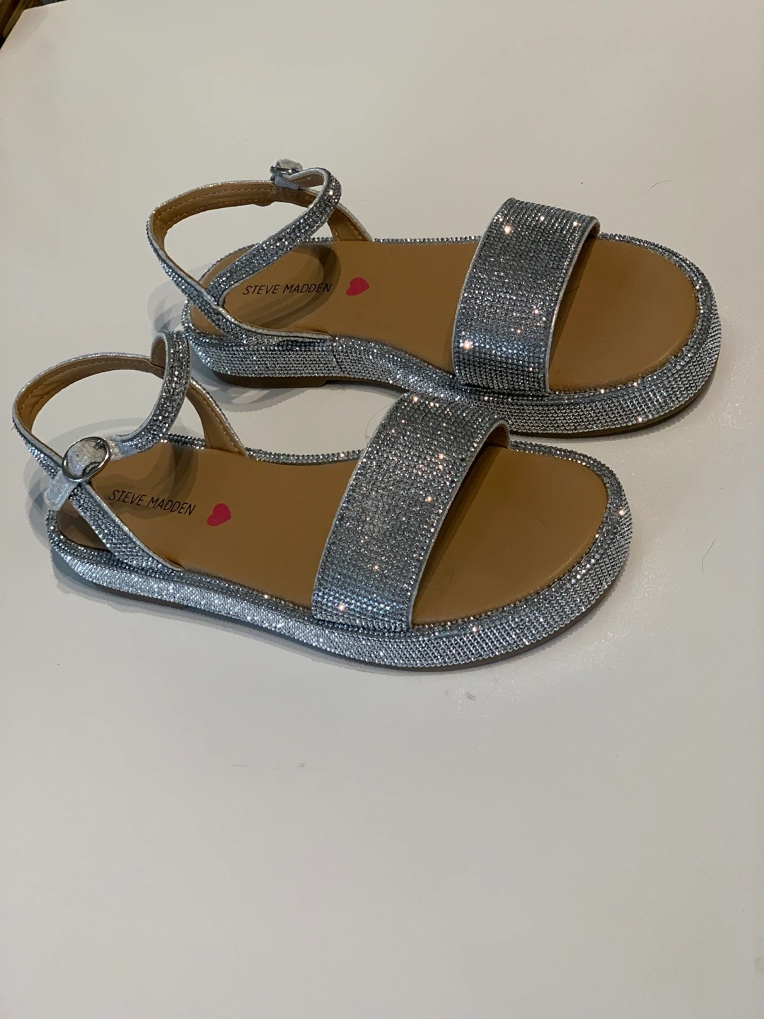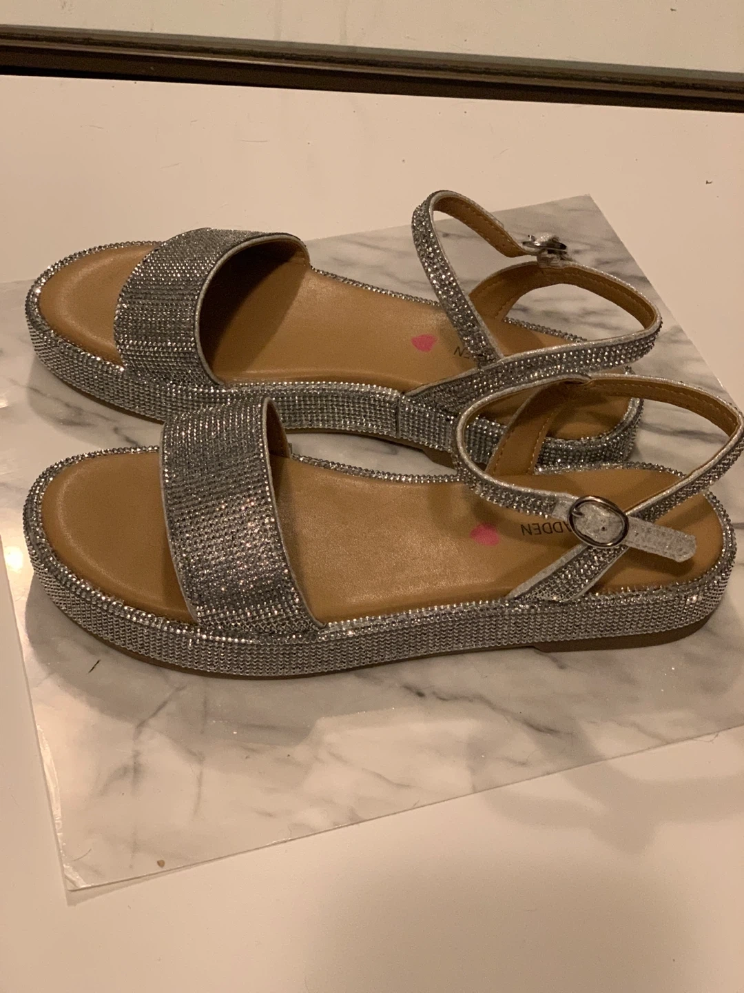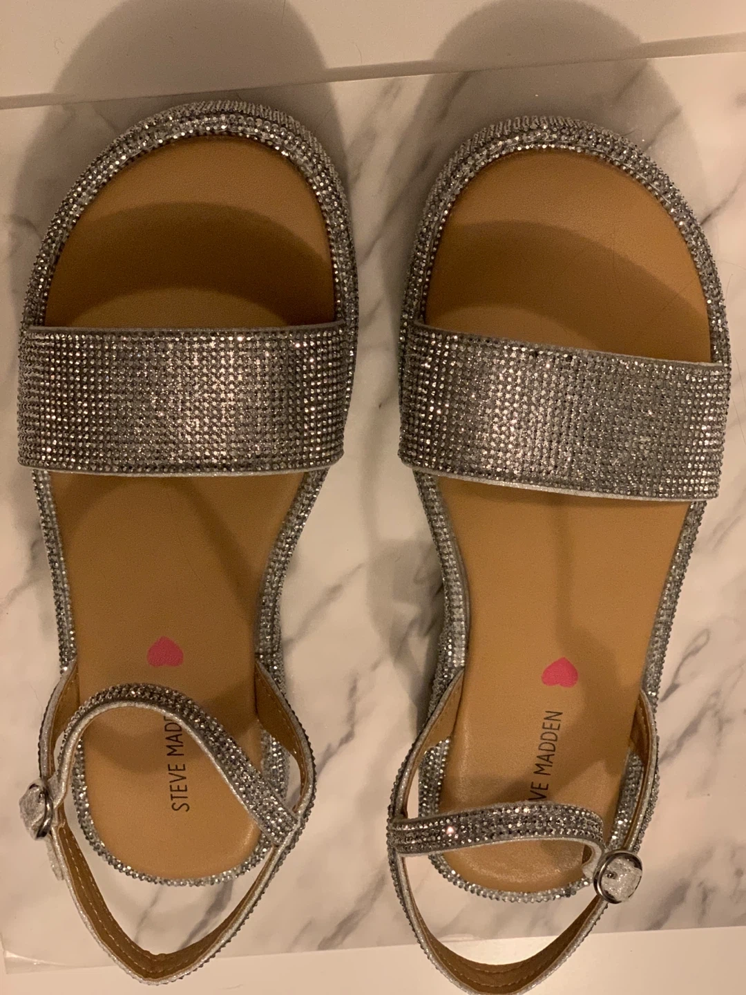 These Steve Madden sandals are covered in dazzling silver (actual) rhinestones. They feature adjustable ankle straps for a secure fit.