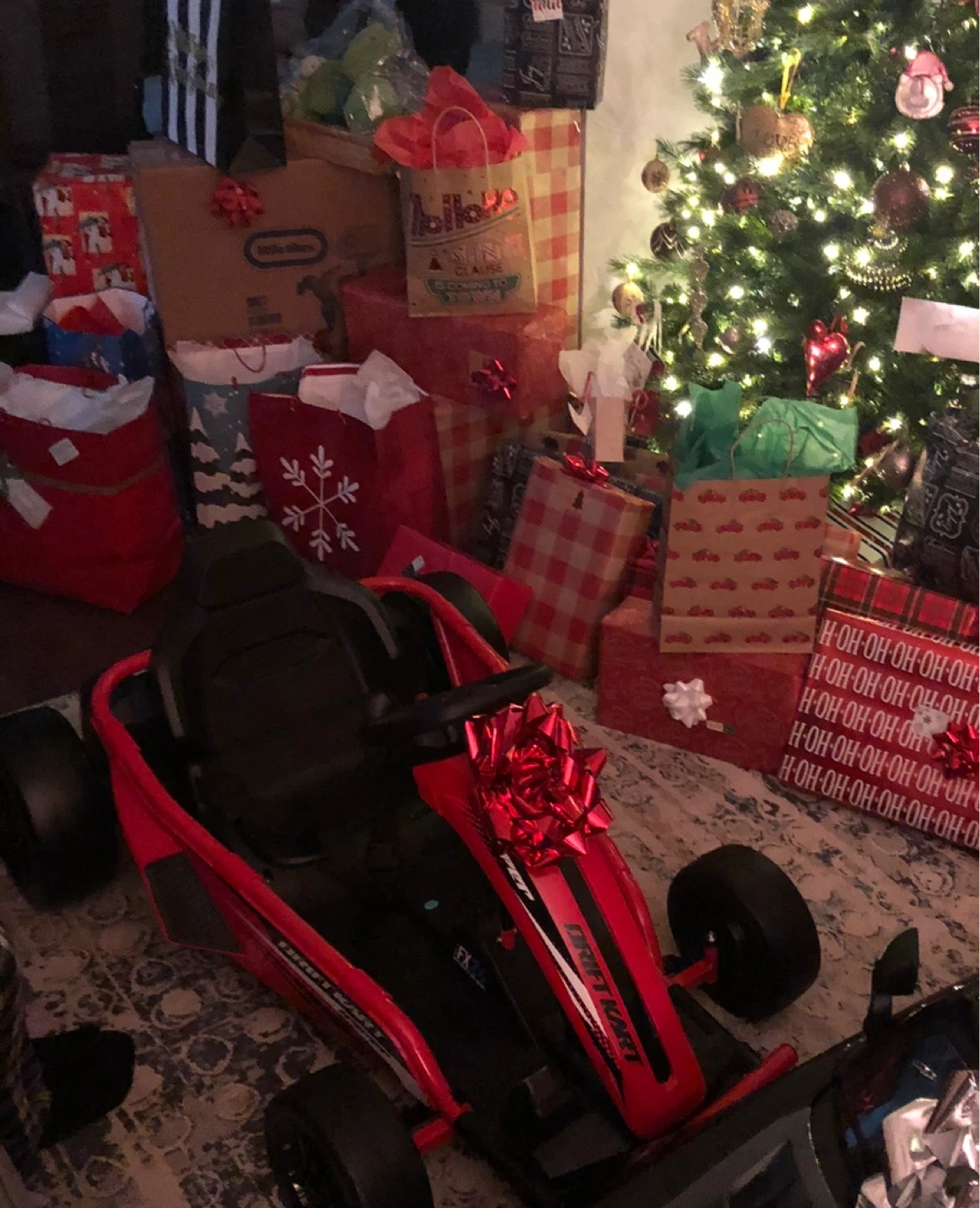 It's a red drift kart ride-on toy. It has black tires and a black seat. It's perfect for outdoor fun!