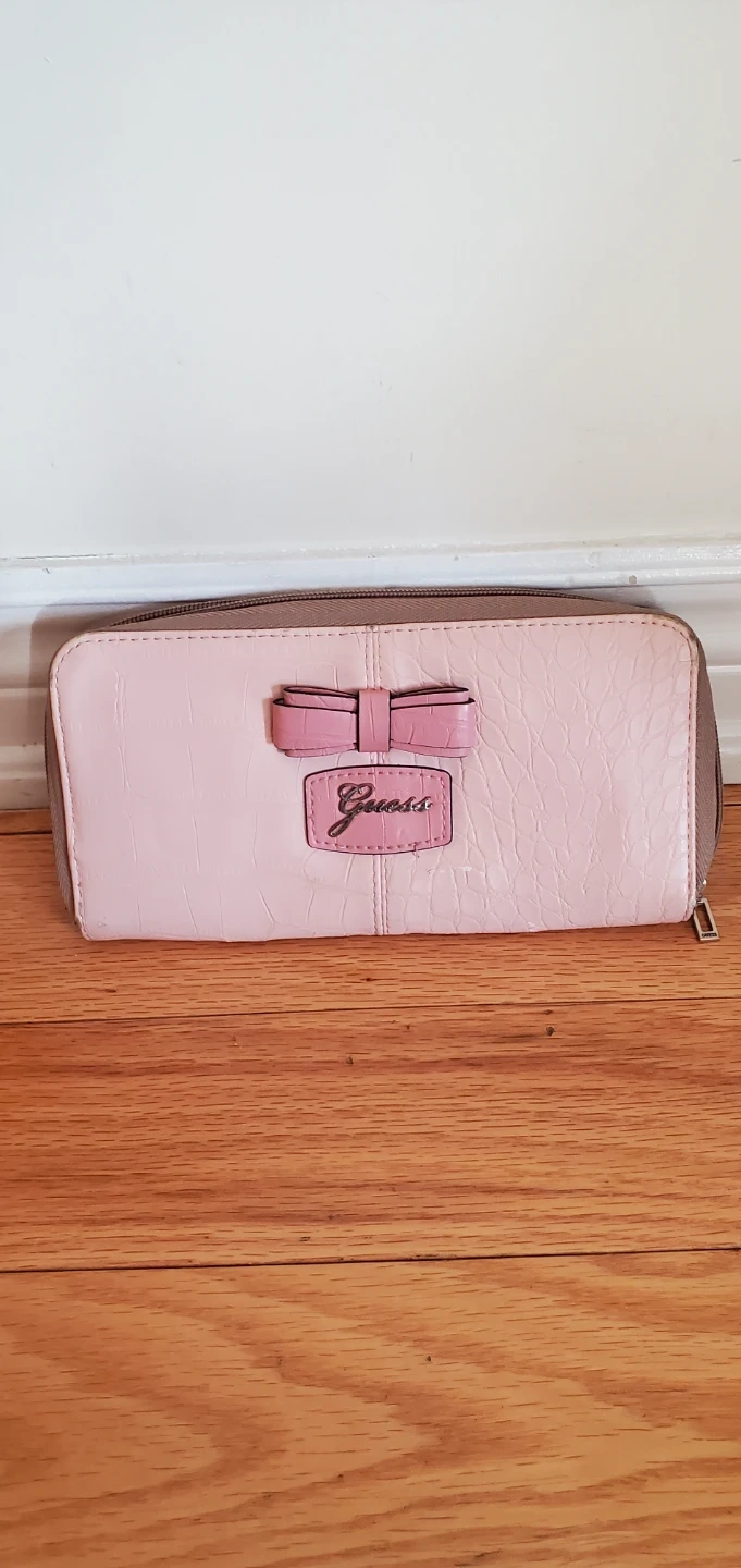 Selling a cute Guess wallet in pink and beige! It has a bow accent on the front and a zip-around closure. Lots of card slots and compartments inside to keep everything organized