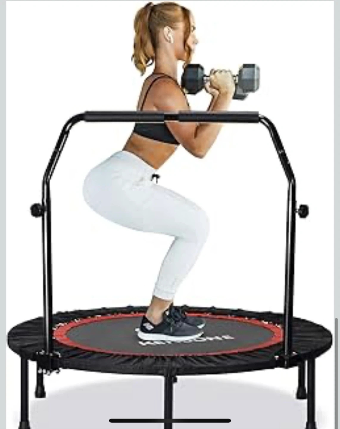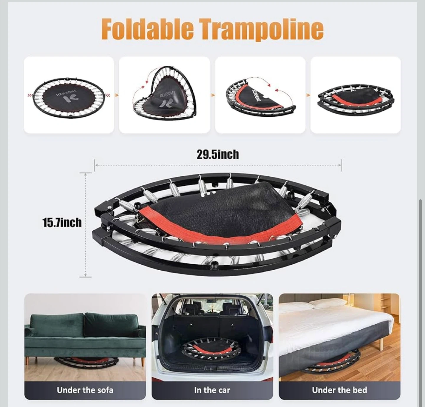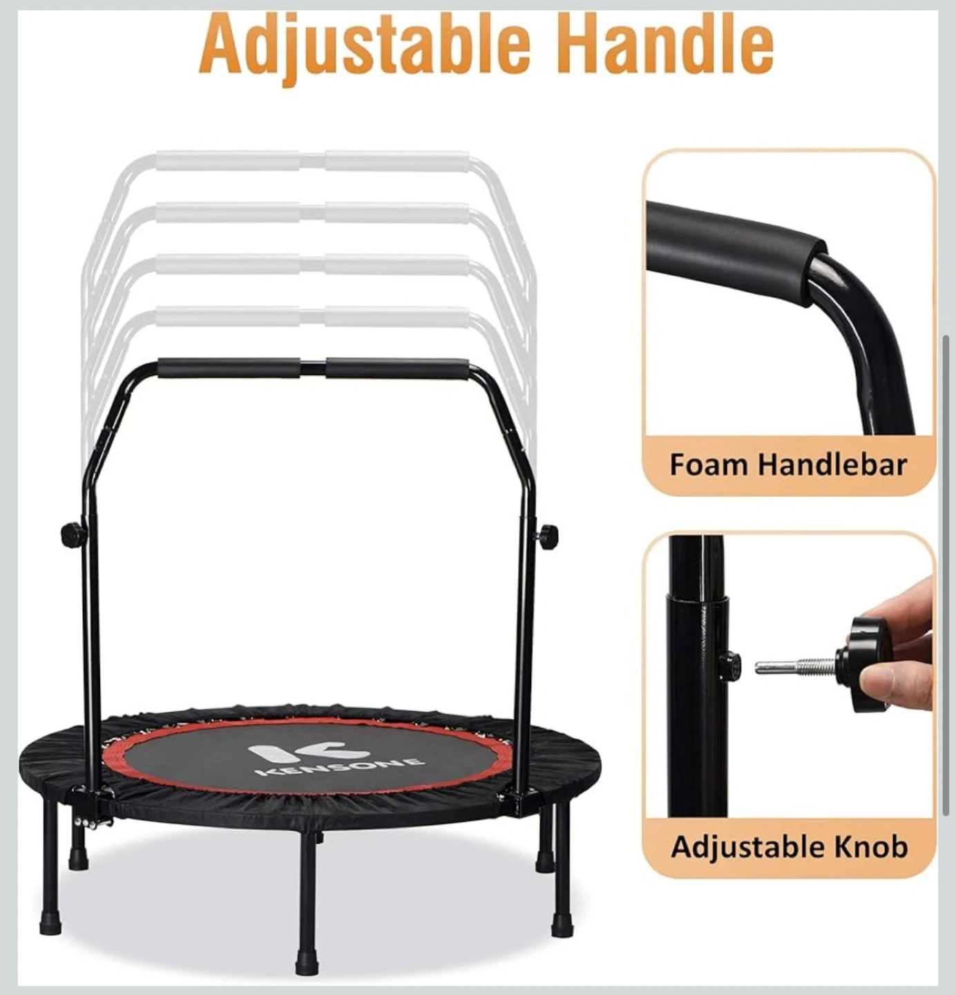 S This Kensone trampoline is foldable for easy storage. It features an adjustable handle with a foam grip for stability during workouts. The trampoline's diameter is 40 inches, with adjustable handle heights of 27.56 or 35.43 inches.