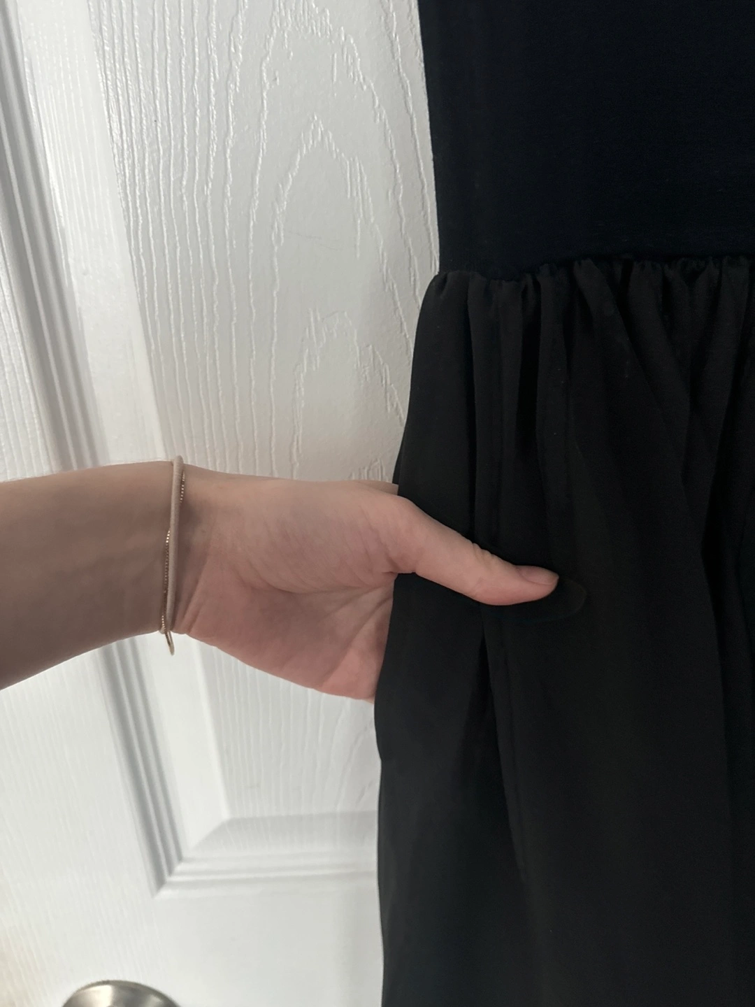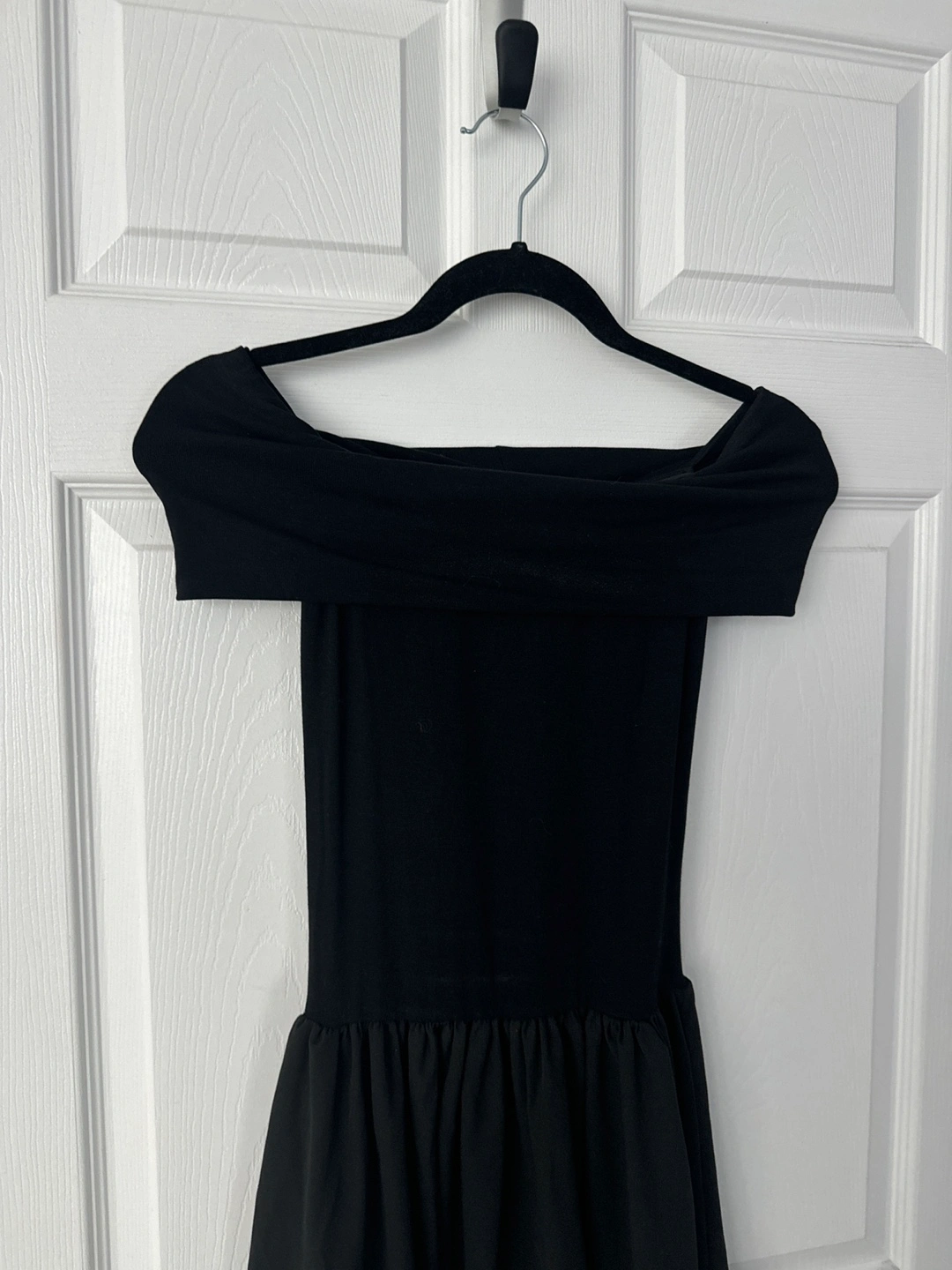 Elegant black maxi dress. iβm 5β6 for me it hits right above the ankle. Features off-the-shoulder neckline and a flowy skirt. Has pockets. Perfect for special occasions.
