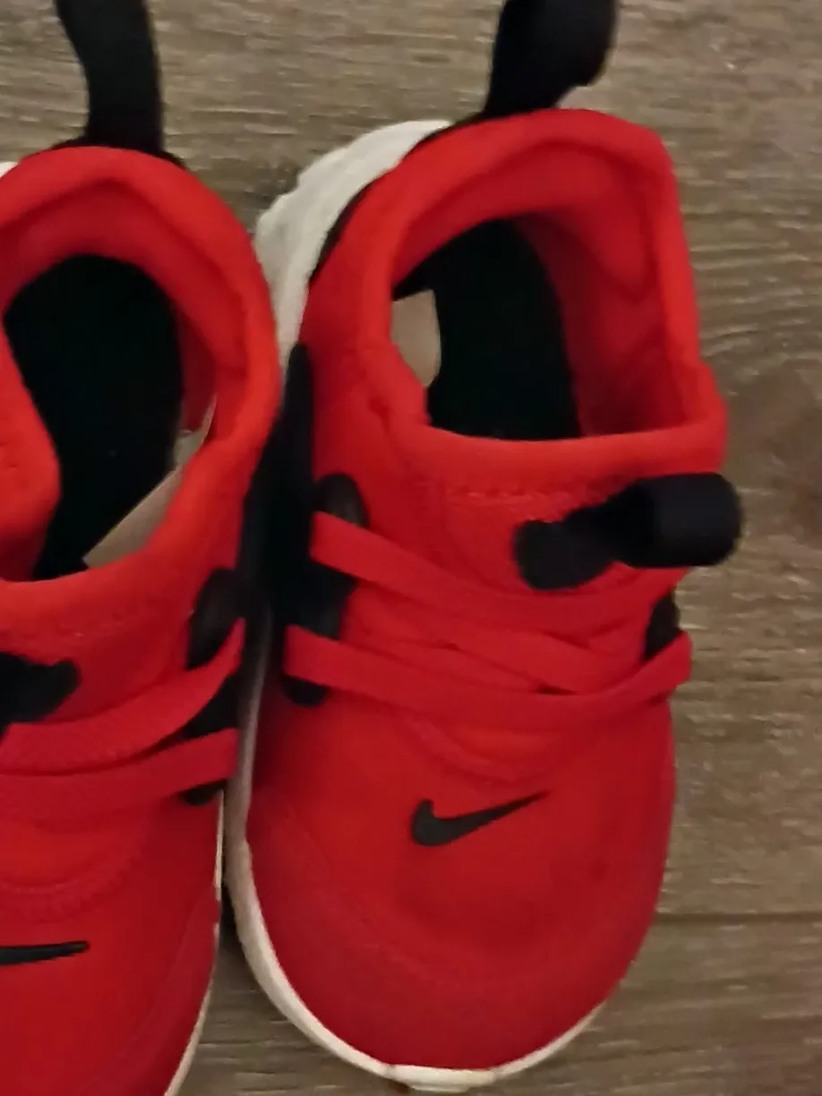 These are red Nike toddler shoes. They feature a lace-up closure and a padded collar for comfort. Rubber outsole provides good traction. Size 5cjsut need a good cleaning