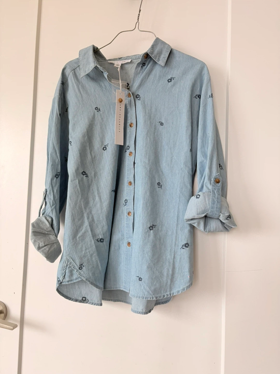 Brand new Chambray button-up shirt with a subtle floral print. Made from 100% cotton. Button cuffs with roll-tab sleeves. Relaxed fit.