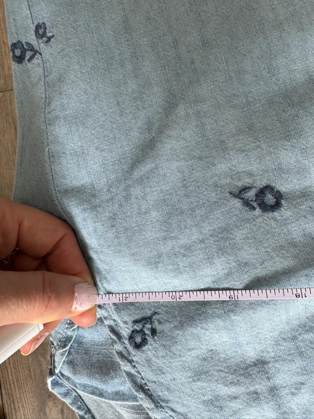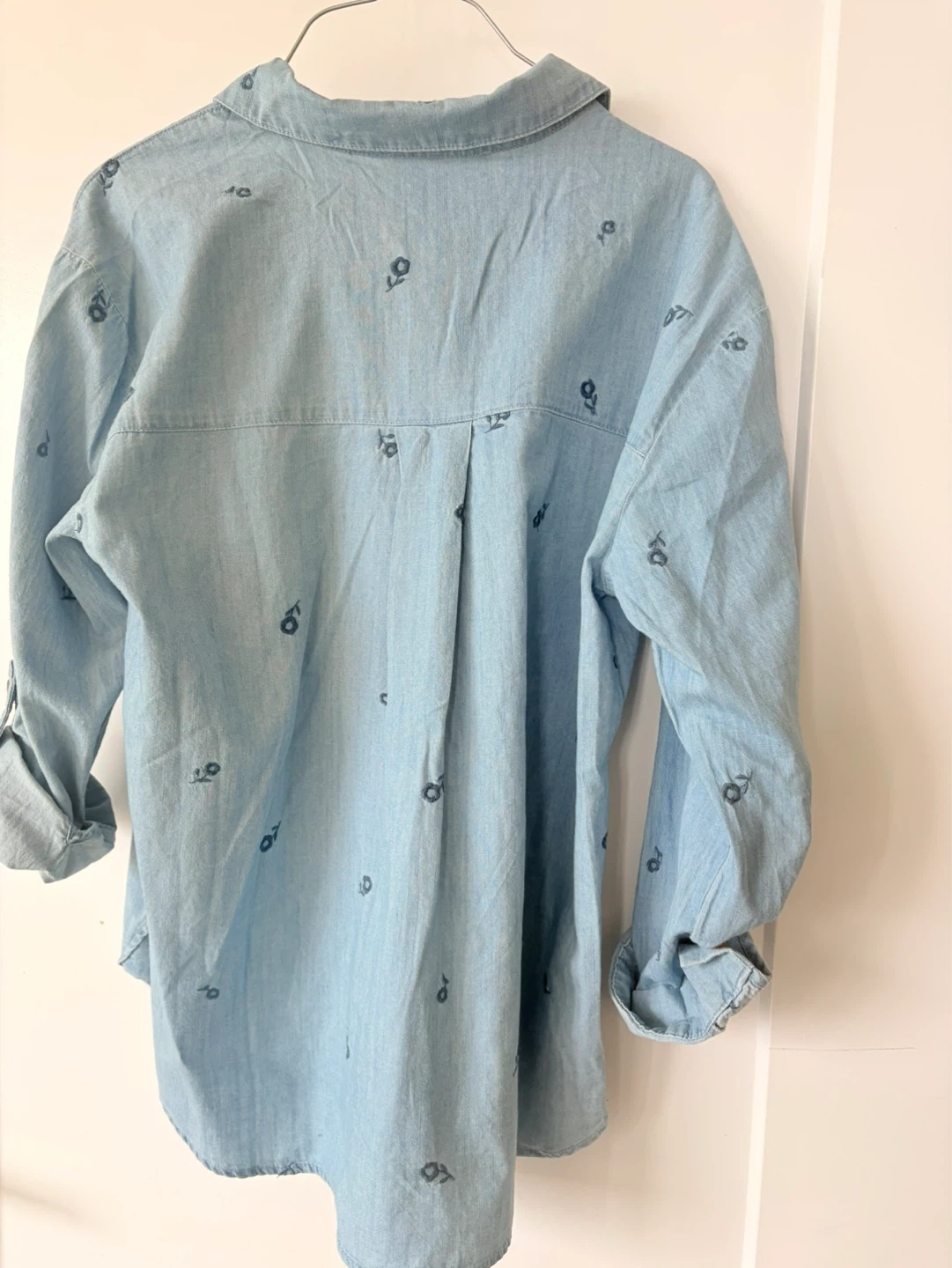 Brand new Chambray button-up shirt with a subtle floral print. Made from 100% cotton. Button cuffs with roll-tab sleeves. Relaxed fit.
