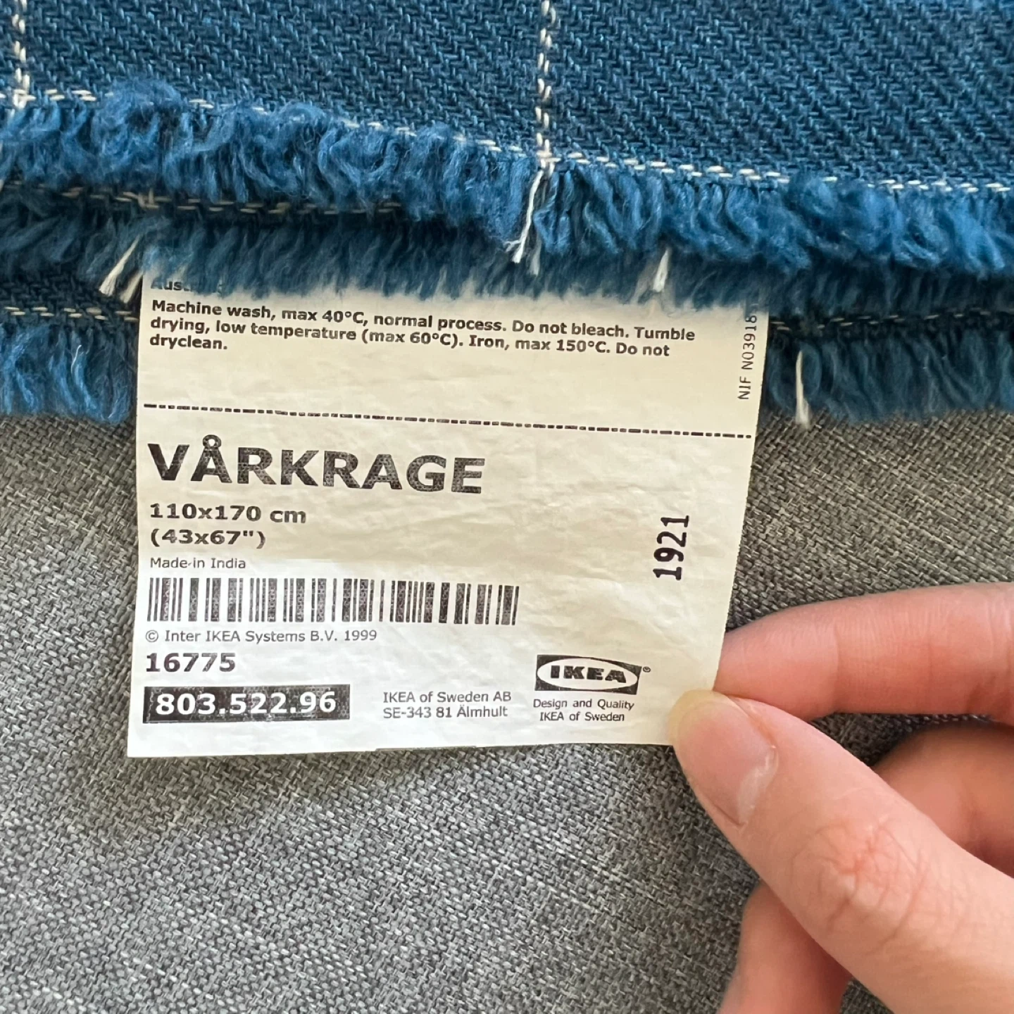 This is an IKEA VÄRKRAGE throw blanket, measuring 110x170 cm (43x67"). The blanket features a blue and white grid pattern with fringed edges. Great for adding a cozy touch to any room!