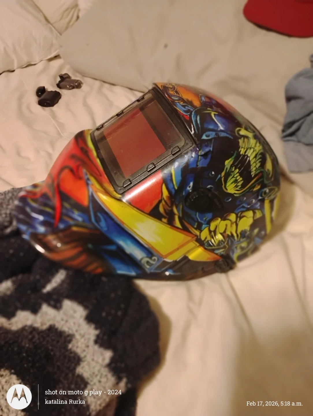 This auto darkening welding helmet features a vibrant, eye-catching graphic of skulls and flames. It's designed for comfort and protection during welding. Suitable for hobbyists and professionals alike!