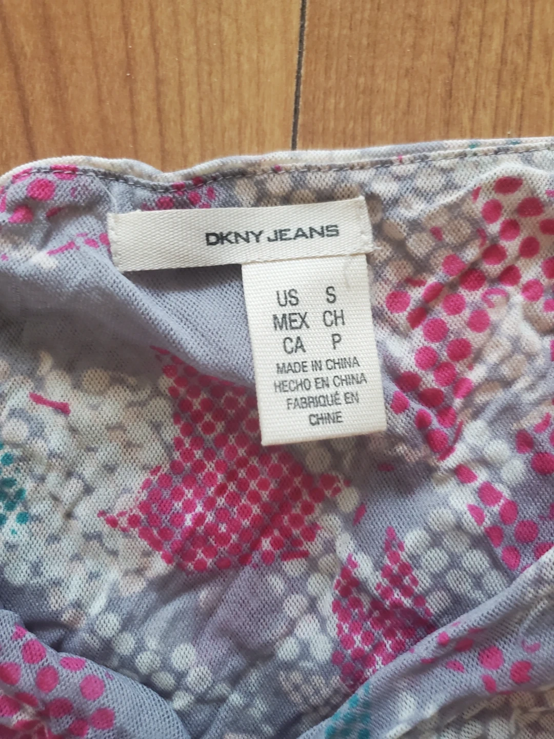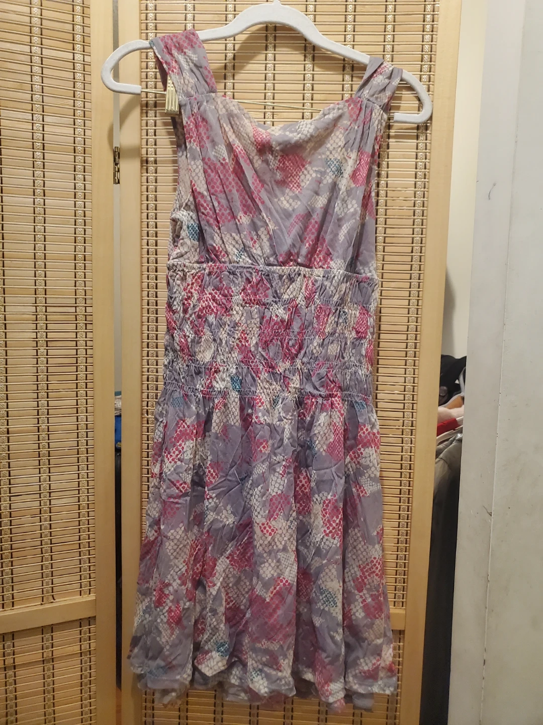 A cute DKNY Jeans sleeveless dress with a colourful snake and dot print. It features smocking at the waist for a flattering fit. Made from 100% nylon for a lightweight feel. Dress it up or down for various occasions!