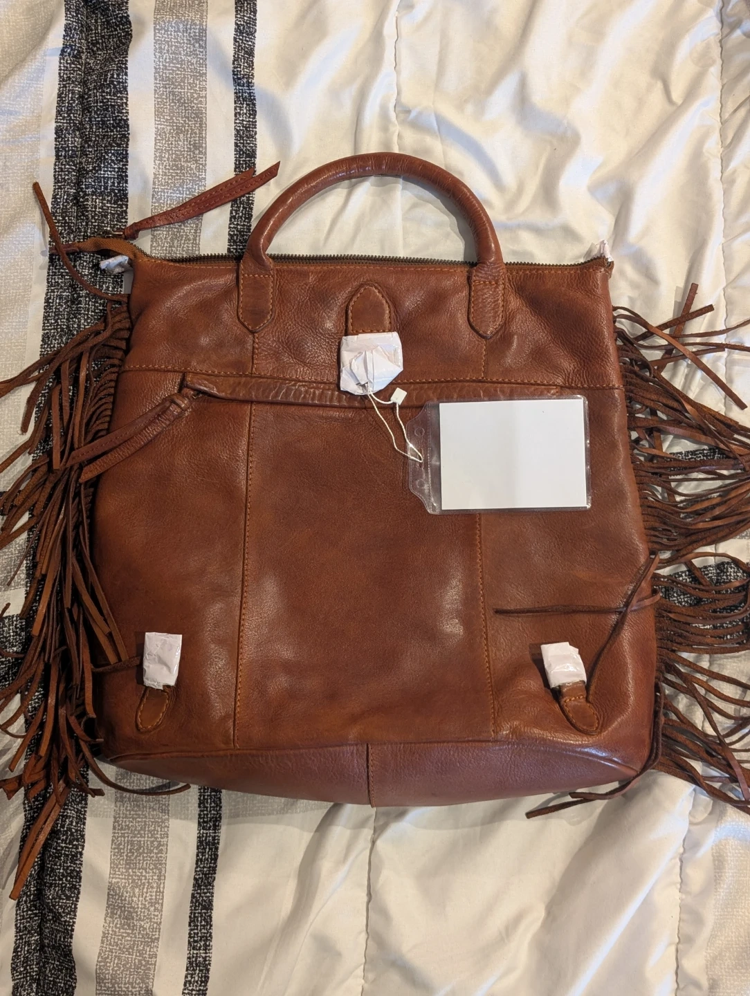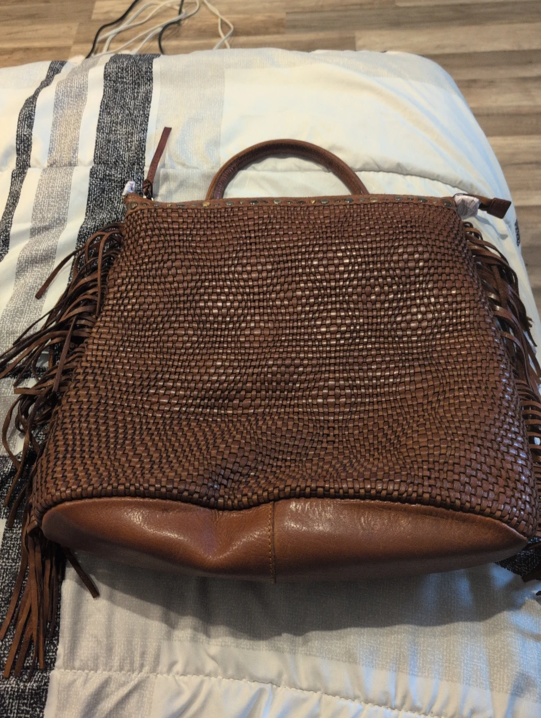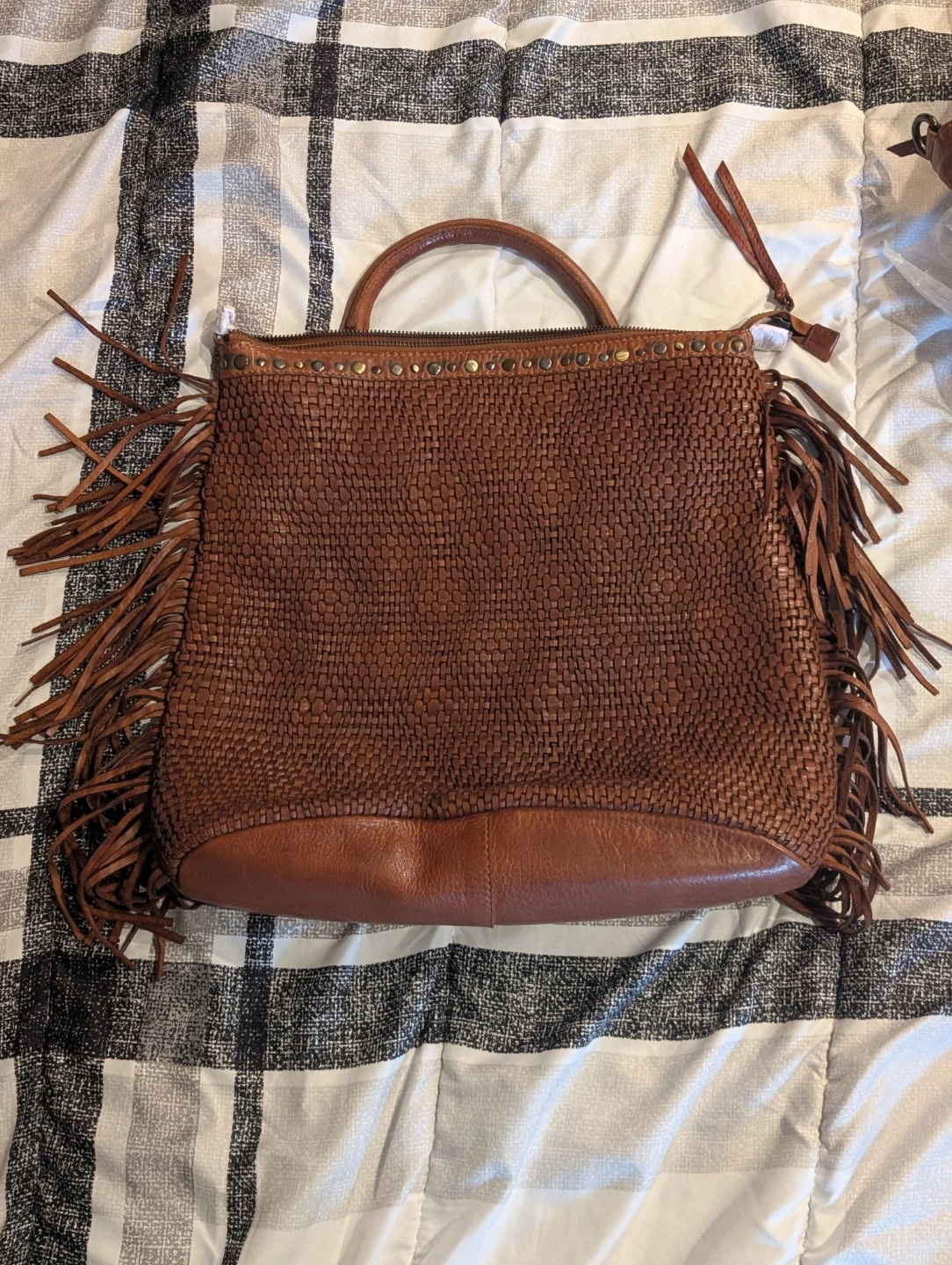 Selling a stunning premium genuine leather woven handbag in a rich cognac brown tone. Crafted with an intricate woven finish and elegant fringe detailing, this bag has a refined boho luxe aesthetic that instantly elevates any outfit.