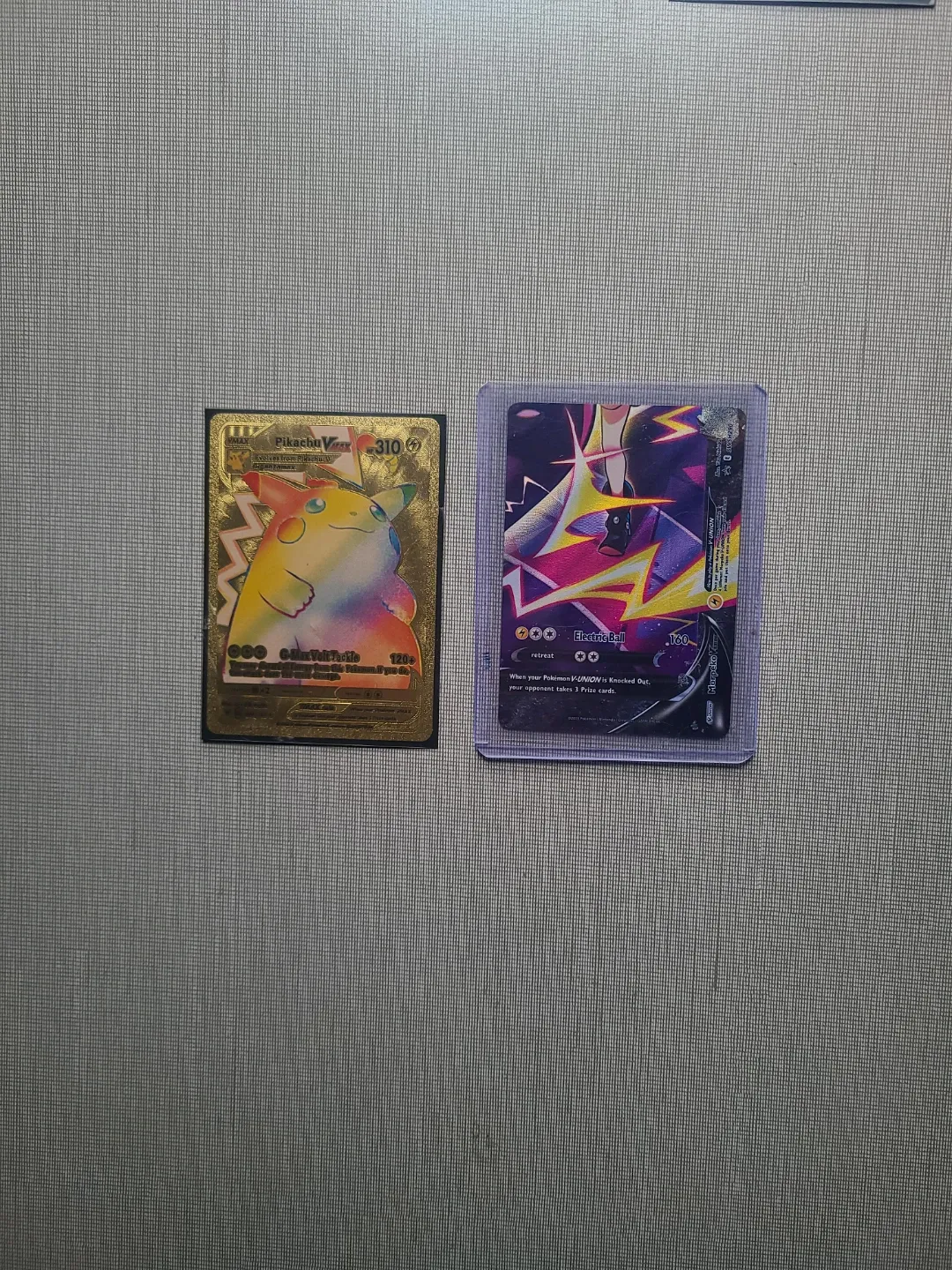 Selling two Pokémon trading cards: a gold Pikachu VMAX and a Morpeko V-UNION card. The Pikachu VMAX has 310 HP and an attack dealing 120+ damage. The Morpeko V-UNION has an Electric Ball attack dealing 160 damage. When your Pokémon V-UNION is Knocked Out, your opponent takes 3 Prize cards.