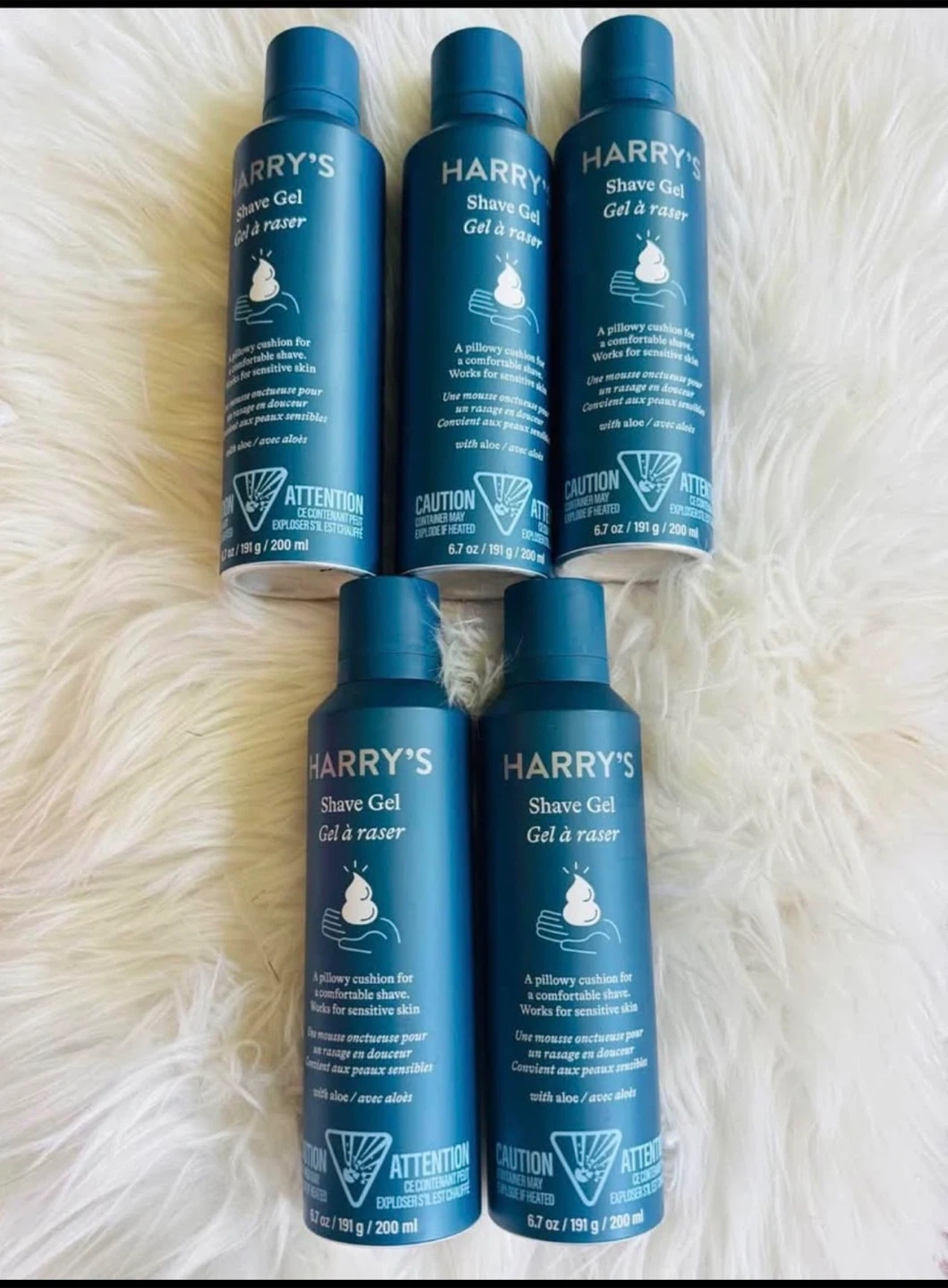 Five bottles of Harry's Shave Gel included. It's formulated for a comfortable shave and works for sensitive skin. Each bottle contains 200 ml and includes aloe.