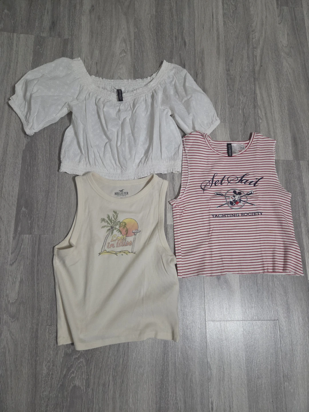 Includes a white off-the-shoulder eyelet top from H&M, a cream tank top with a tropical graphic from Hollister, and a red and white striped tank top from Divided. These tops are great for casual wear. $5 each.