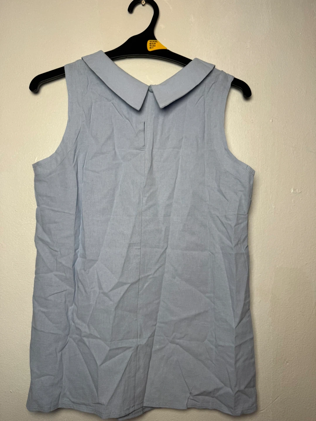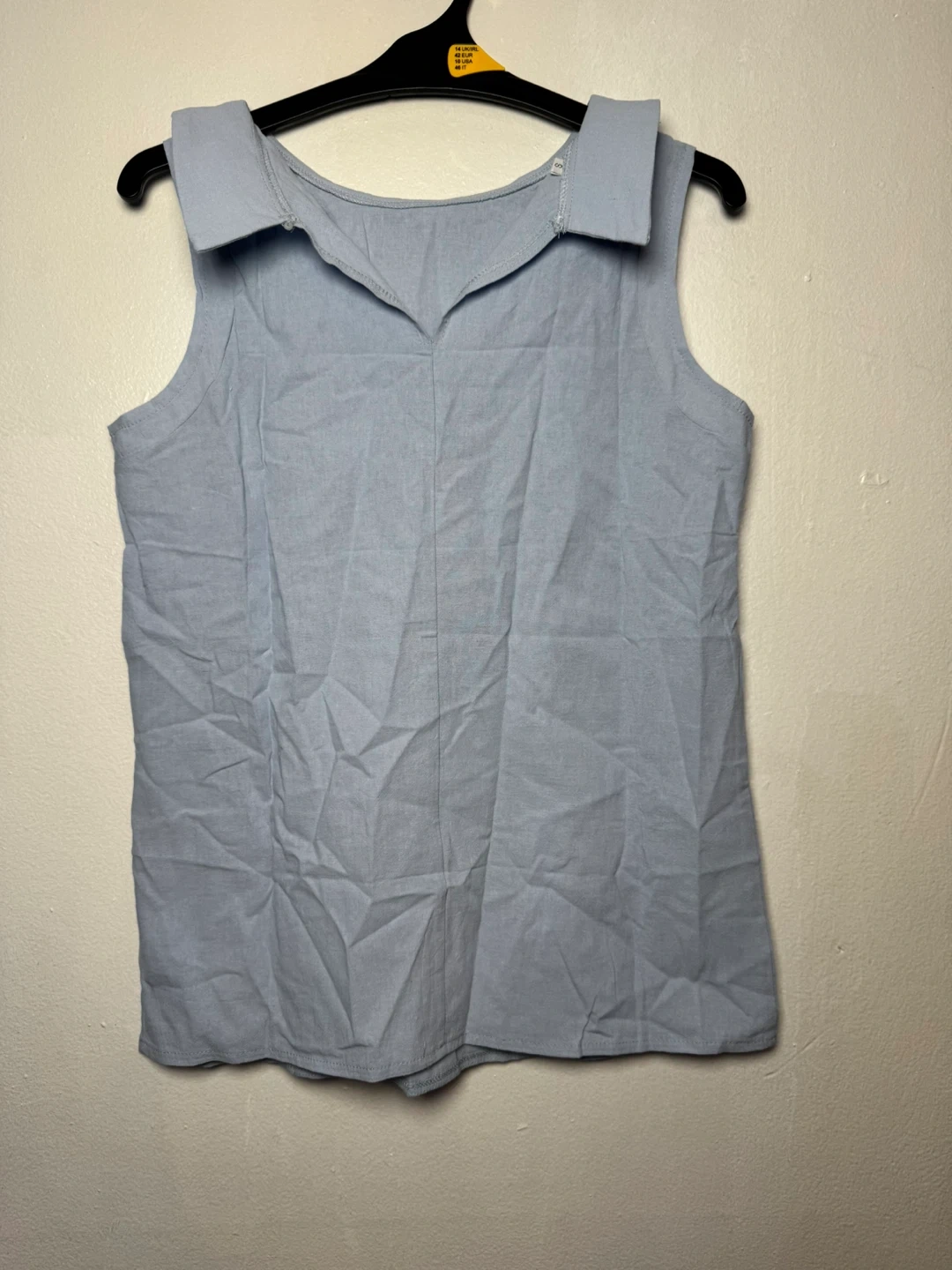 This is a light blue sleeveless top with a collared neckline. It's made of a soft fabric. The size tag indicates it's an S. It's a versatile piece for layering or wearing on its own!