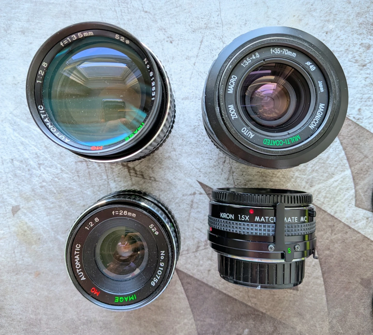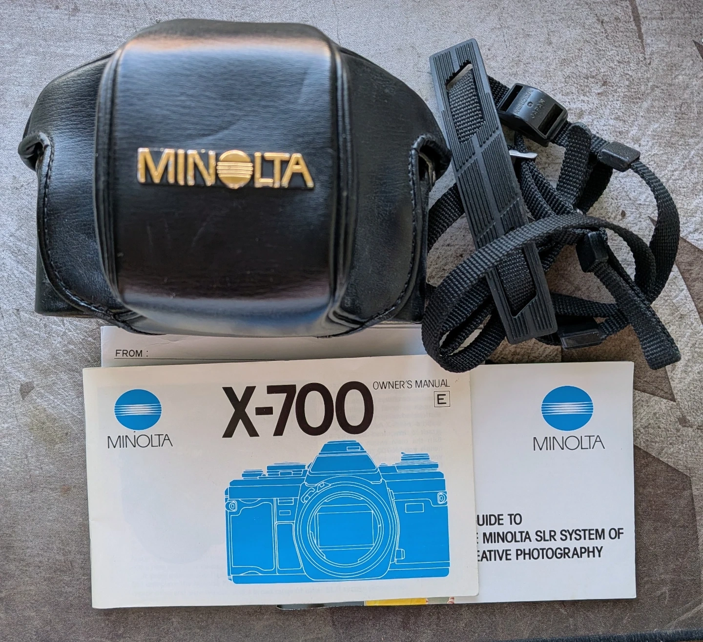 This is a Minolta X-700 film SLR camera system. It includes the camera body, a flash unit, and multiple lenses: 50mm, 35-70mm zoom, 28mm, and 135mm plus a teleconverter.. Also included are the owner's manual, a leather case, and a Minolta light meter. This kit is ready for creative photography!