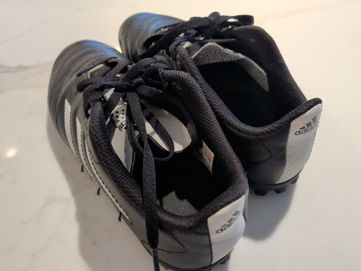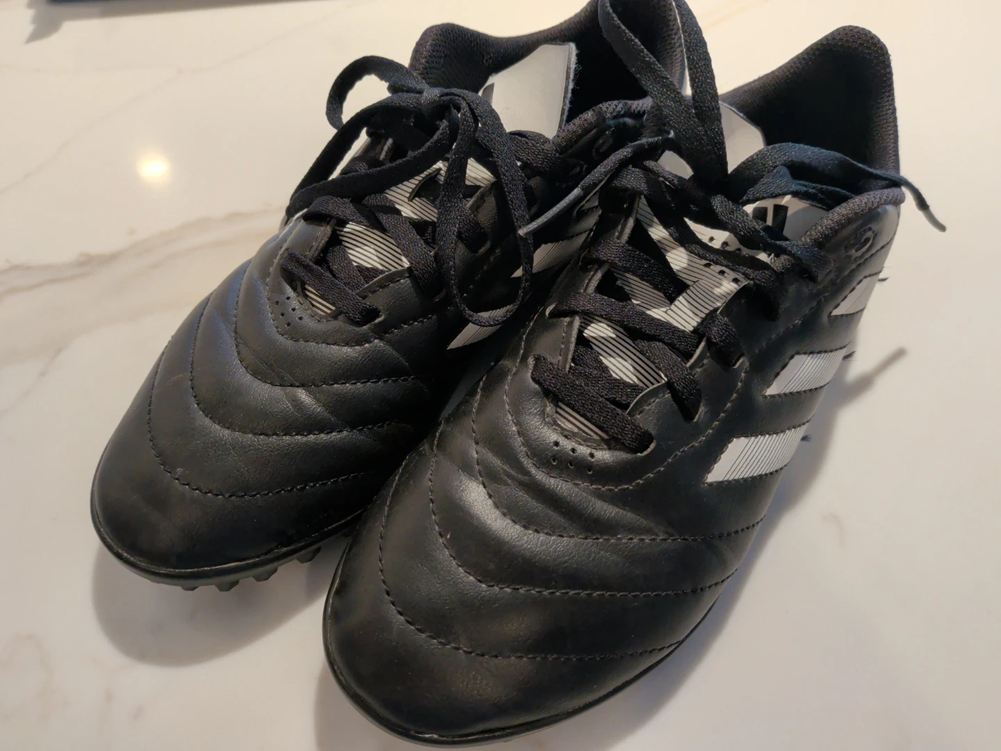Black Adidas Goletto VIII TF J football cleats. Size US 5, UK 4.5, FR 37.3, JP 235, CHN 230. These cleats are designed for artificial turf and offer good traction. They're ready for the next game!