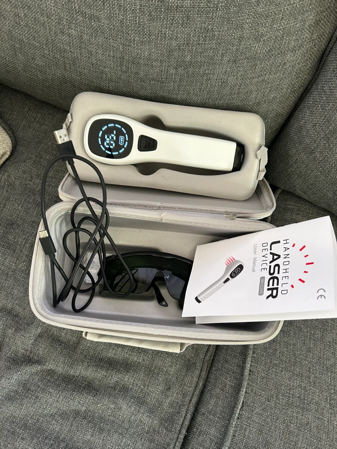 Comes with laser device, protective glasses, charging cord, instruction manual and protective carry case