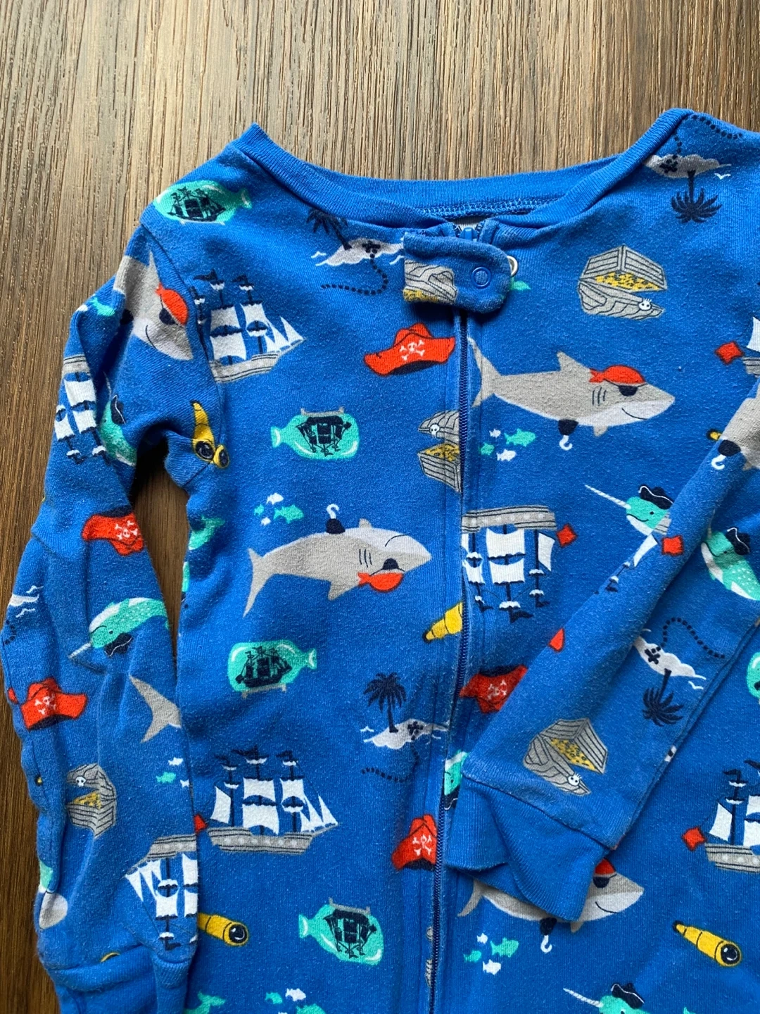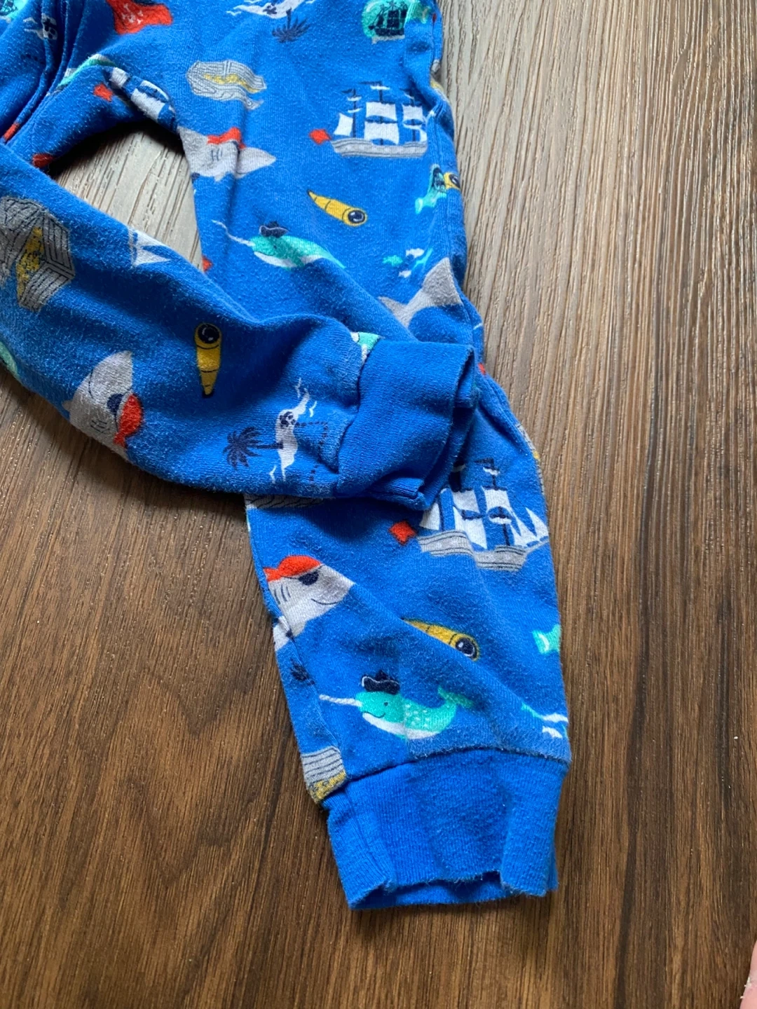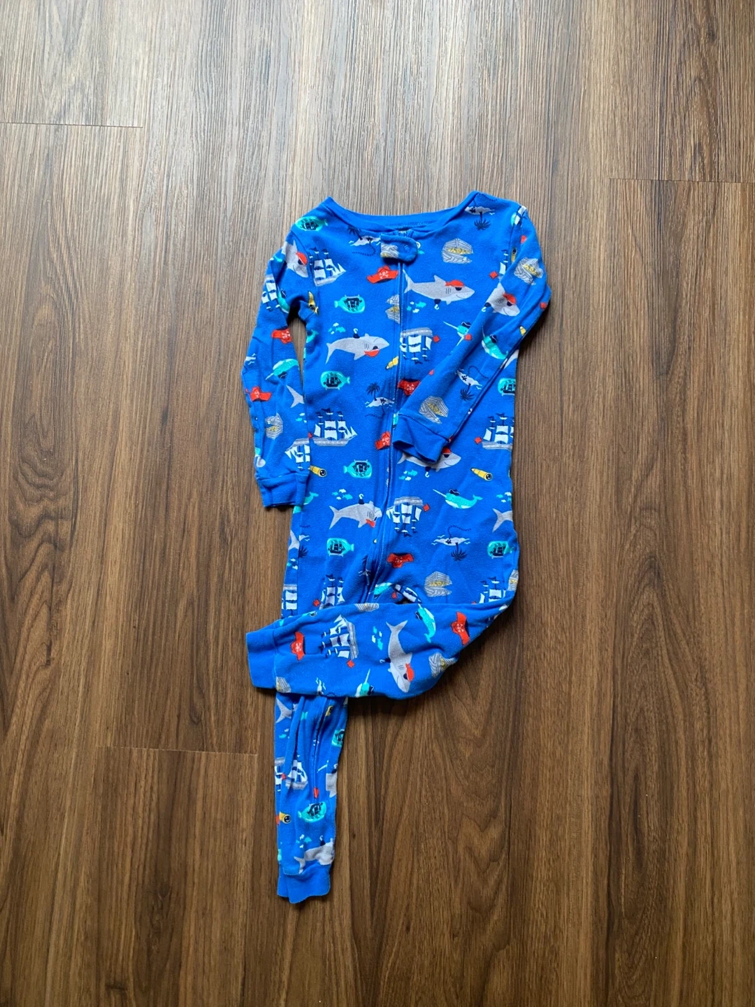 Blue long-sleeved pajamas with a fun shark, pirate ship, and treasure chest print. It's a size 4T and made from flame-resistant material. It zips up the front for easy dressing.