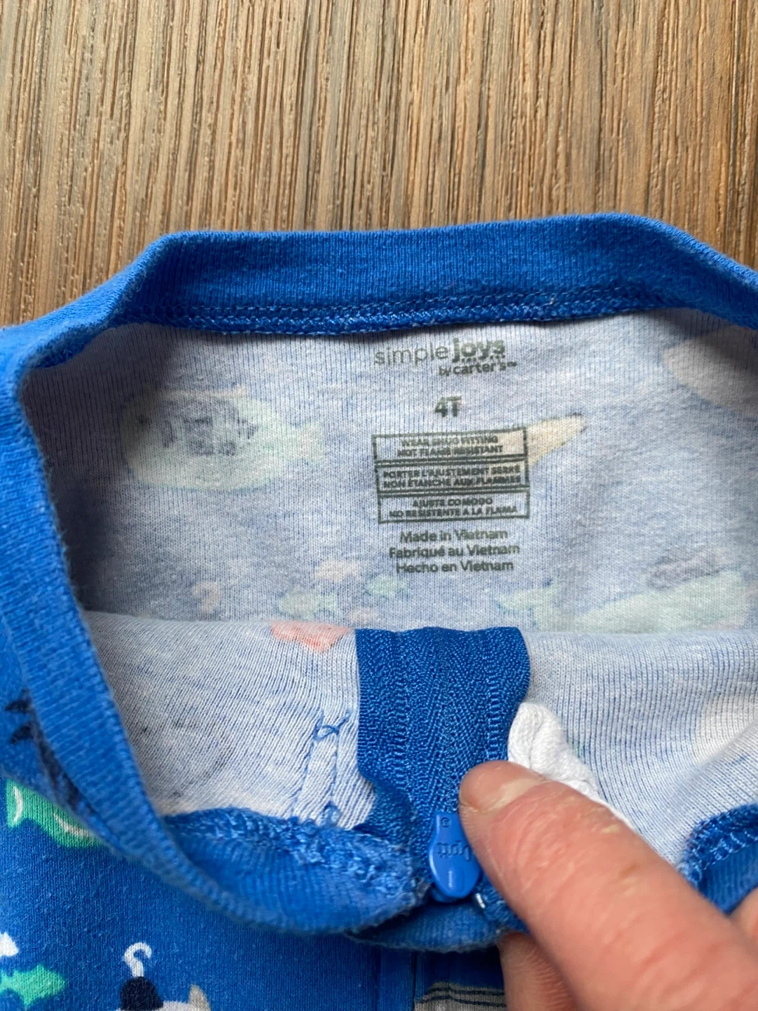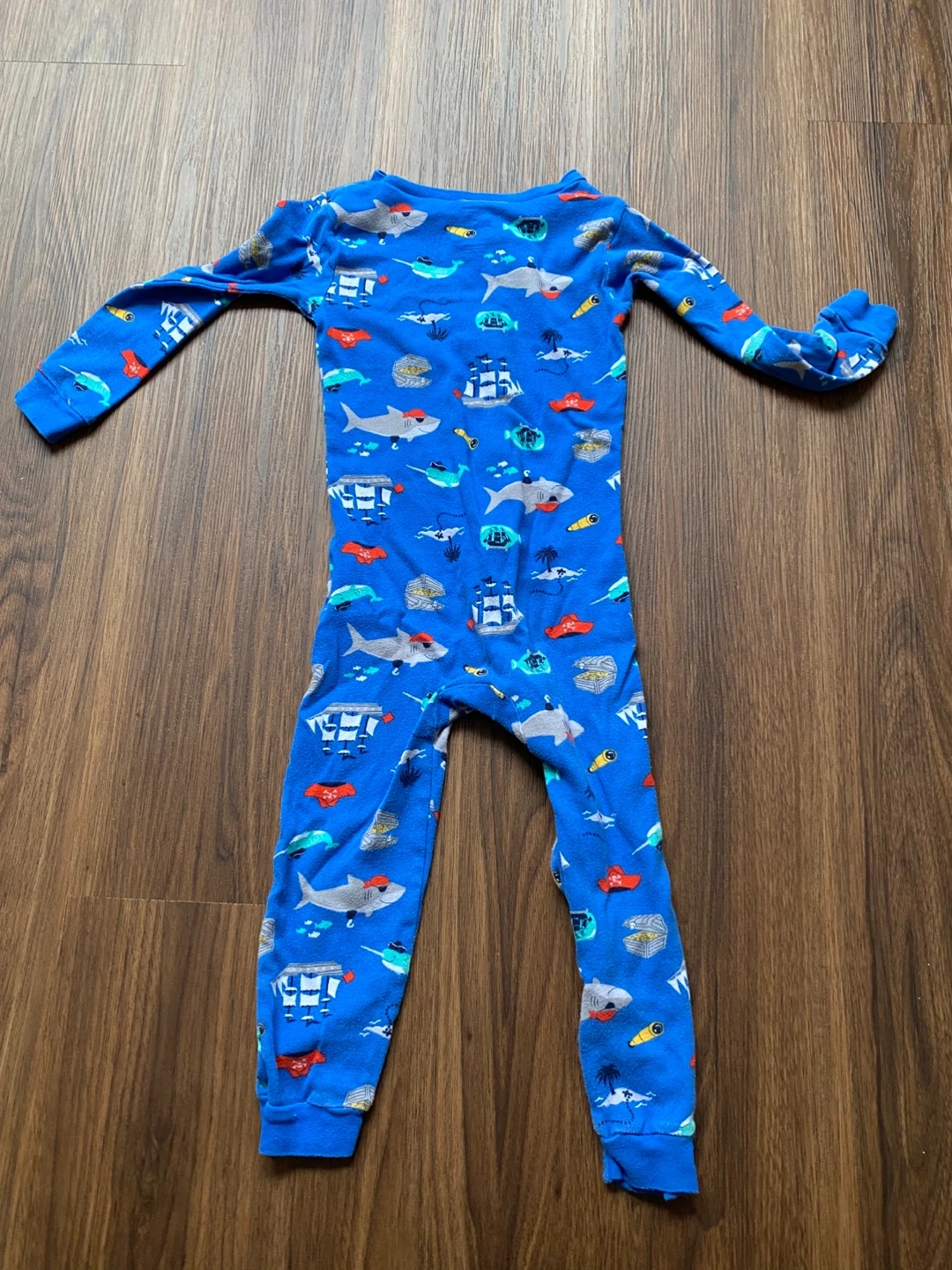 Blue long-sleeved pajamas with a fun shark, pirate ship, and treasure chest print. It's a size 4T and made from flame-resistant material. It zips up the front for easy dressing.