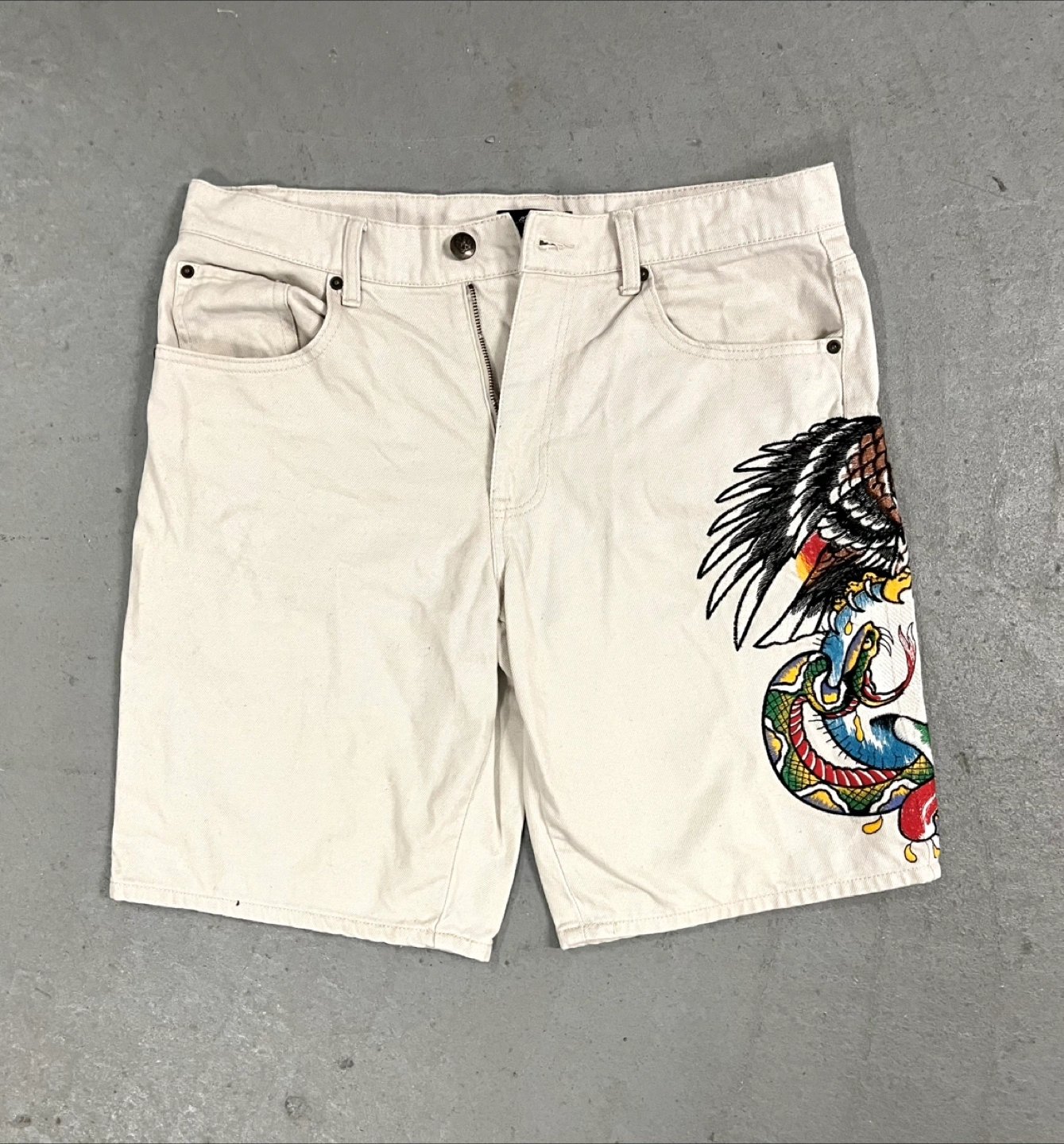 Size 32 loose fit. Cream coloured Ed Hardy denim shorts with iconic eagle and snake graphic on the side and large embroidered logo on the back. It's lined with a tattoo-style print. These shorts make a statement!