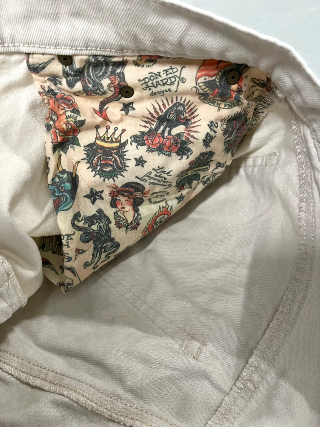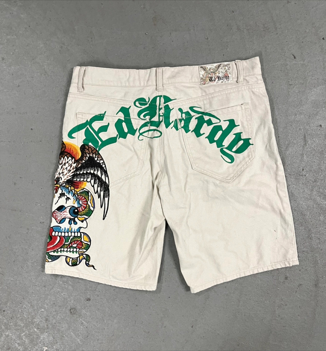 Size 32 loose fit. Cream coloured Ed Hardy denim shorts with iconic eagle and snake graphic on the side and large embroidered logo on the back. It's lined with a tattoo-style print. These shorts make a statement!