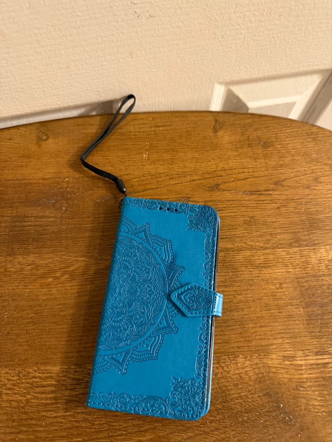 This flip wallet phone case comes in a vibrant blue with an embossed mandala design. It features card slots and a secure clasp. It also includes a convenient wrist strap for easy carrying.