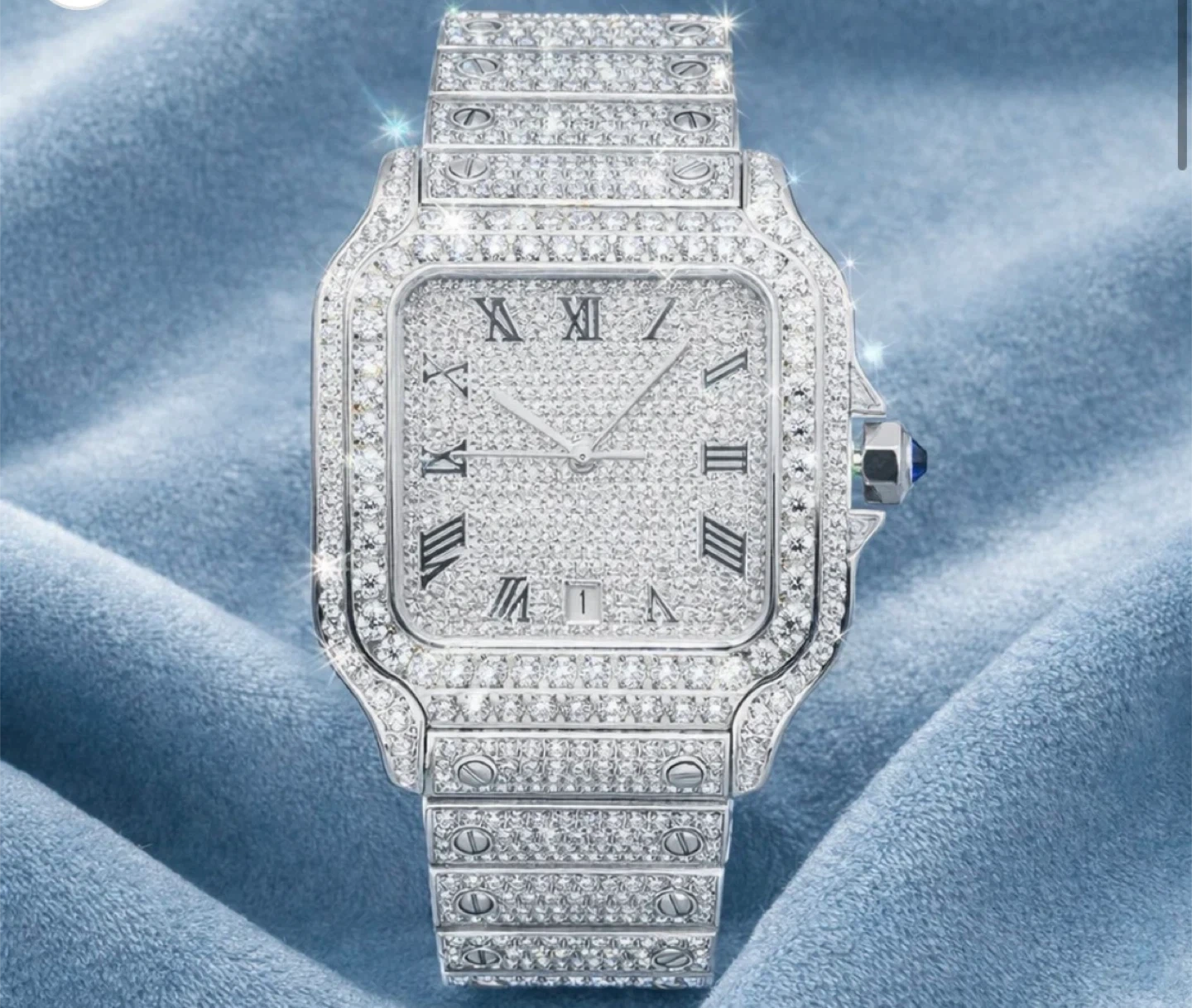 The stainless steel band is also encrusted with sparkling stones. This timepiece adds a touch of luxury to any outfit!