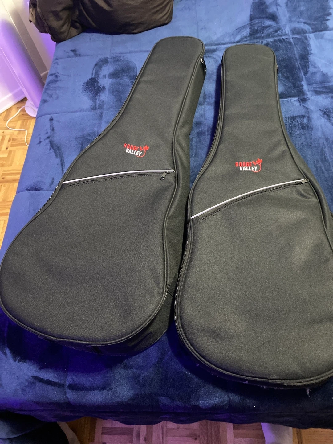 Two black Gator Cases gig bags for electric guitars. They're made of durable black nylon with red interior lining. Each bag has a zippered compartment and handles for carrying.