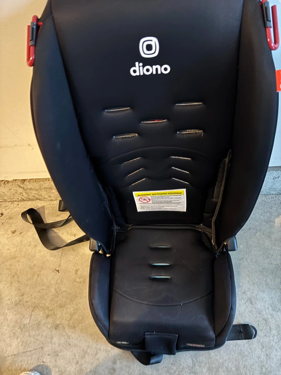 This Diono booster seat is black. It's a Radian 3R model. Manufactured in 2022. Certified for use in aircraft, only when used with a booster mode. Suitable for children from 40 to 120 lbs.