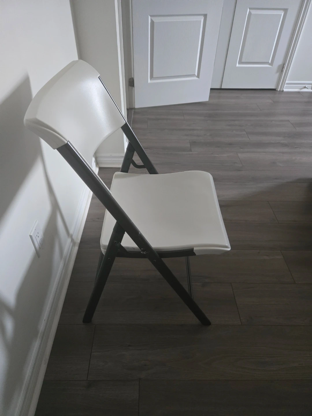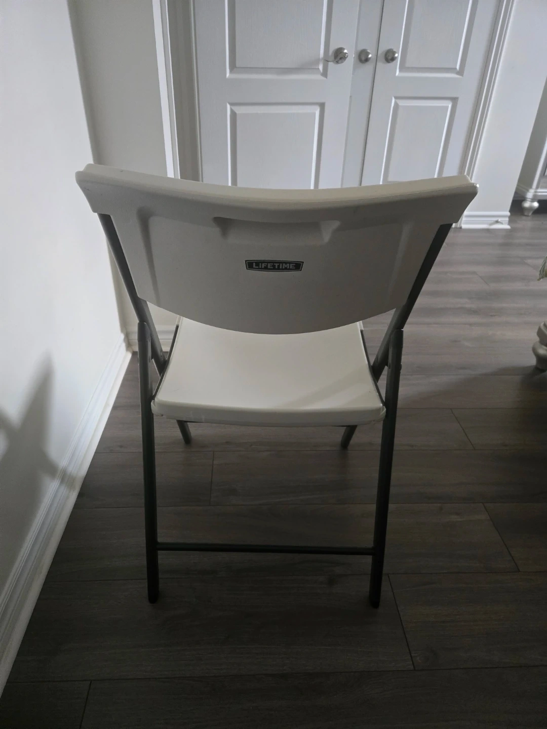 This is a white folding chair made by Lifetime. It features a durable plastic seat and back with a steel frame. Perfect for extra seating when you need it!